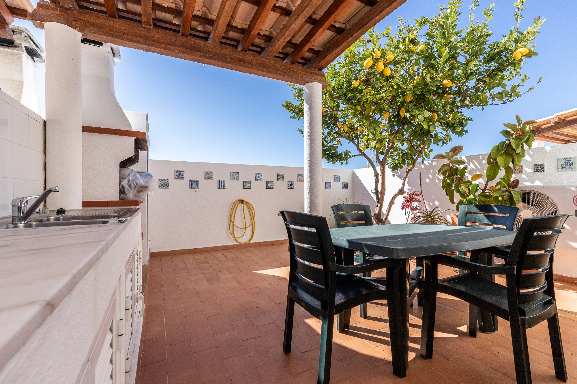 Pátio com BBQ, lava loiça, chuveiro, mesa, cadeiras e sombrinha.