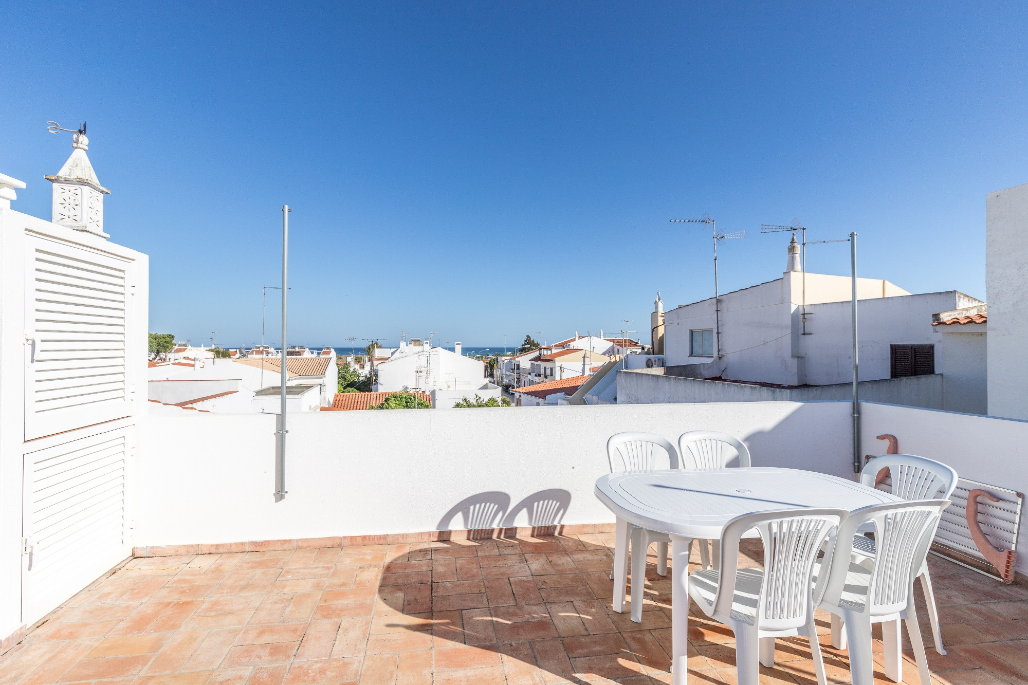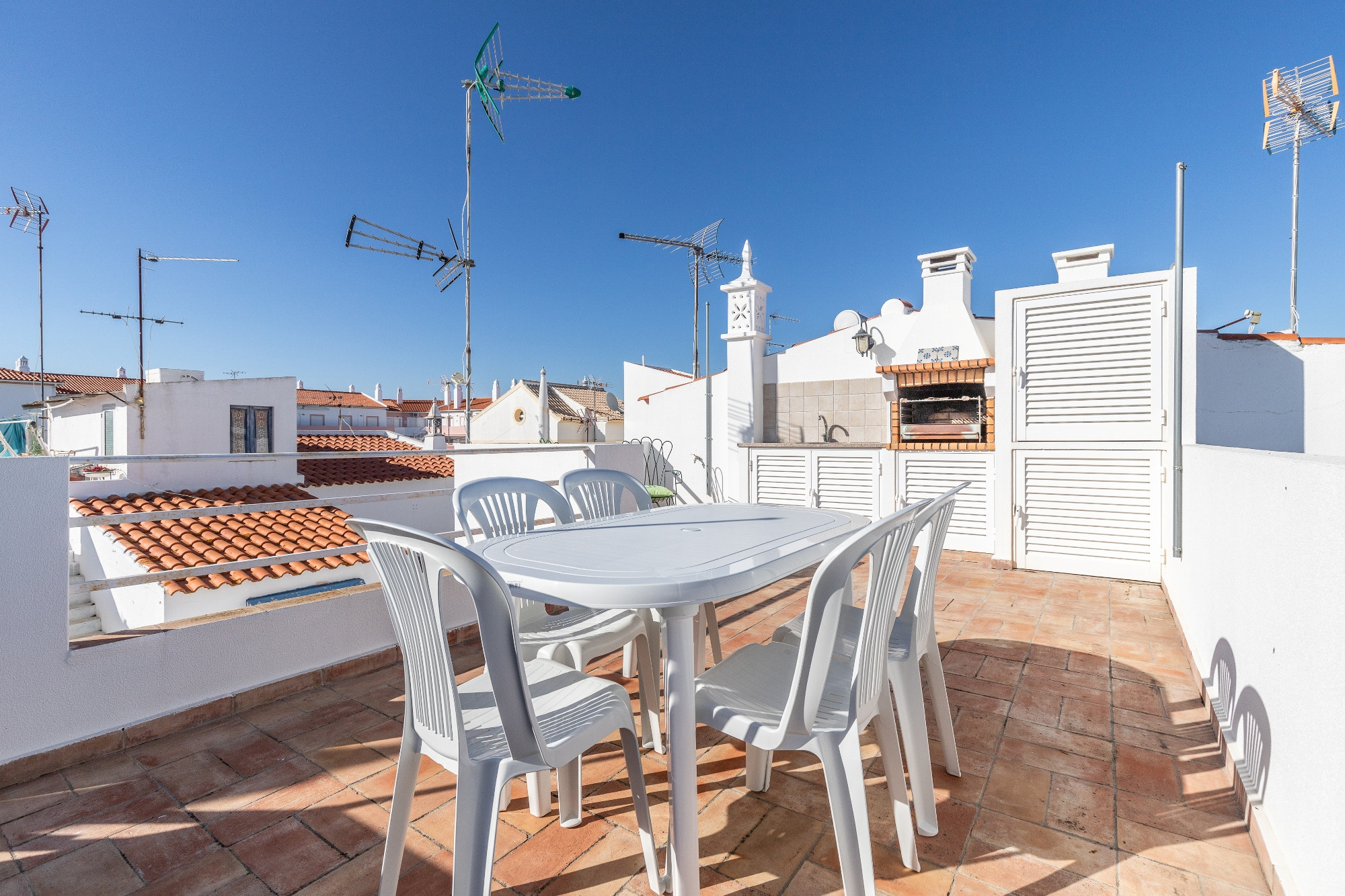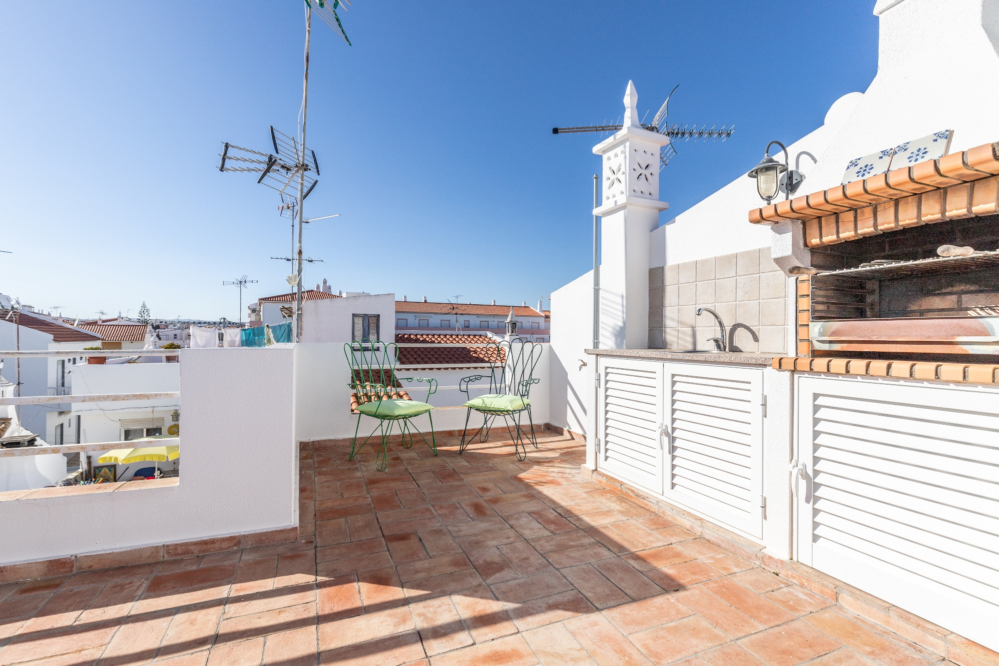 Tem depois umas escadas em ferro que dão acesso ao segundo terraço (açoteia), ai encontramos um barbeque, zona de refeições, zona de máquina de lavar roupa e de arrumos e uma vista mar espectacular e ainda com espaço para banhos de sol.