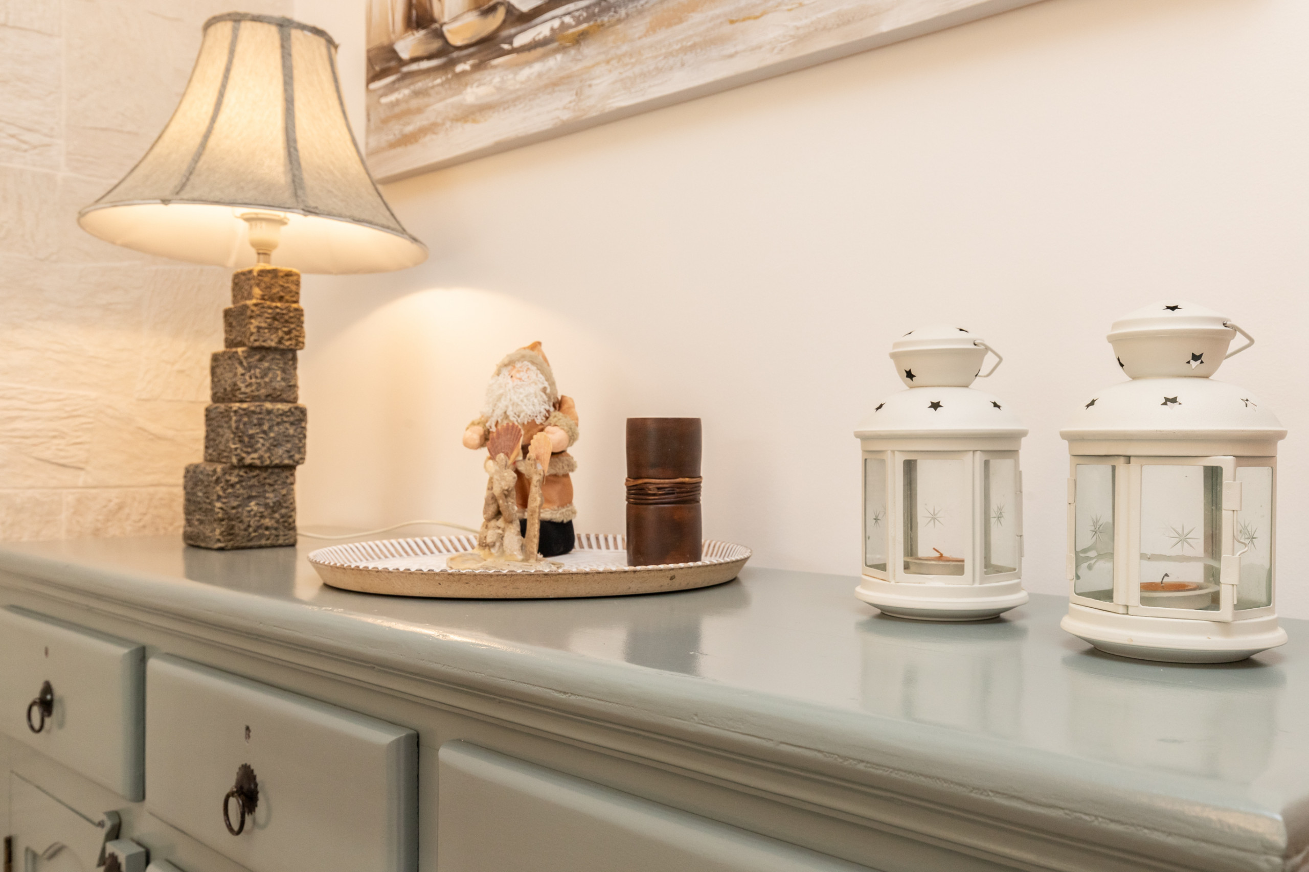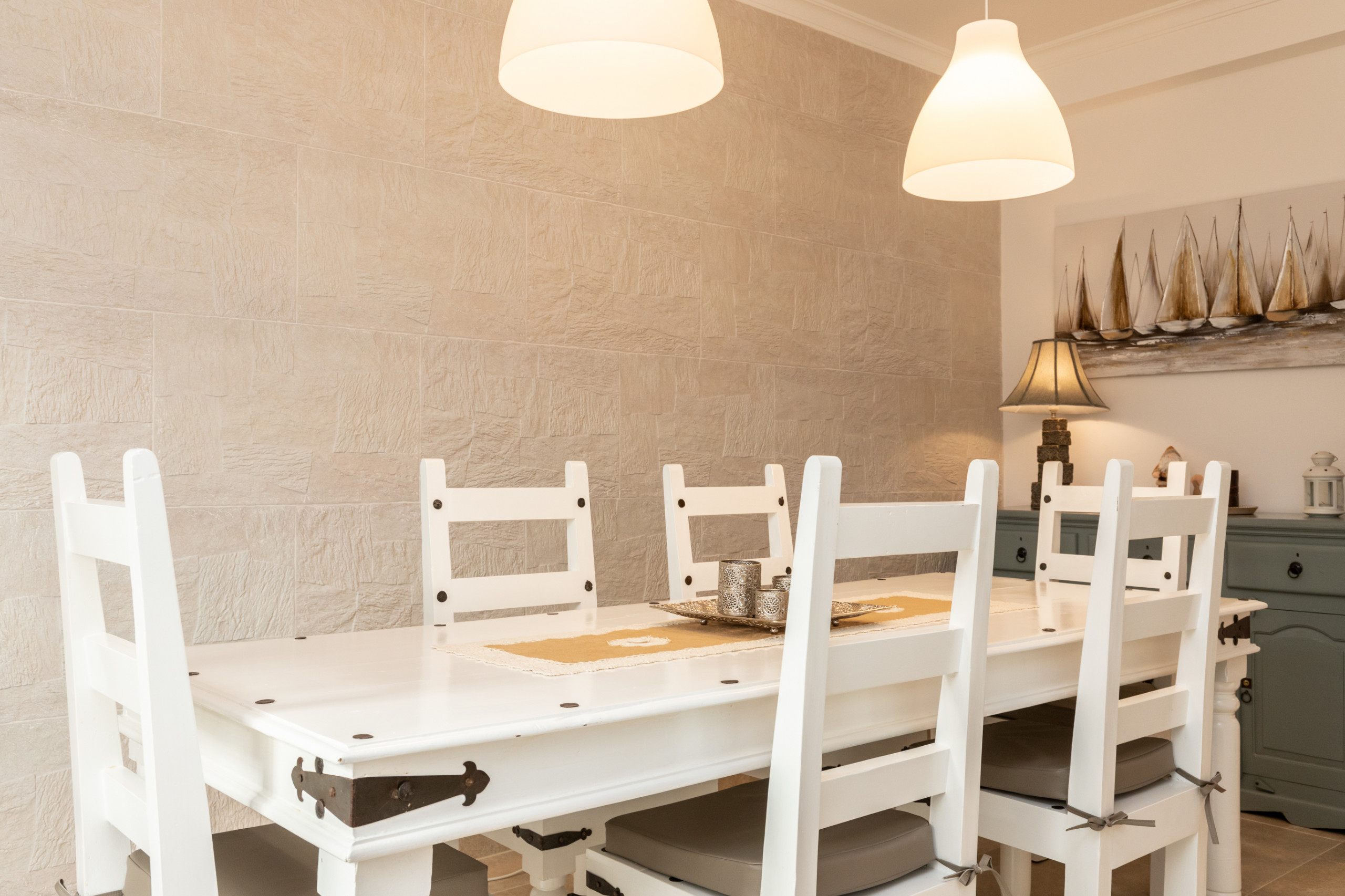 En el exterior, los huéspedes pueden disfrutar de dos patios espaciosos. El patio de entrada, orientado al oeste, cuenta con una ducha exterior, ideal después de un día de playa. La segunda terraza, orientada al este y con acceso desde la sala y una de las habitaciones, dispone de barbacoa, mesa y bancos de piedra y sombrilla, creando el espacio perfecto para comidas al aire libre en familia o con amigos.