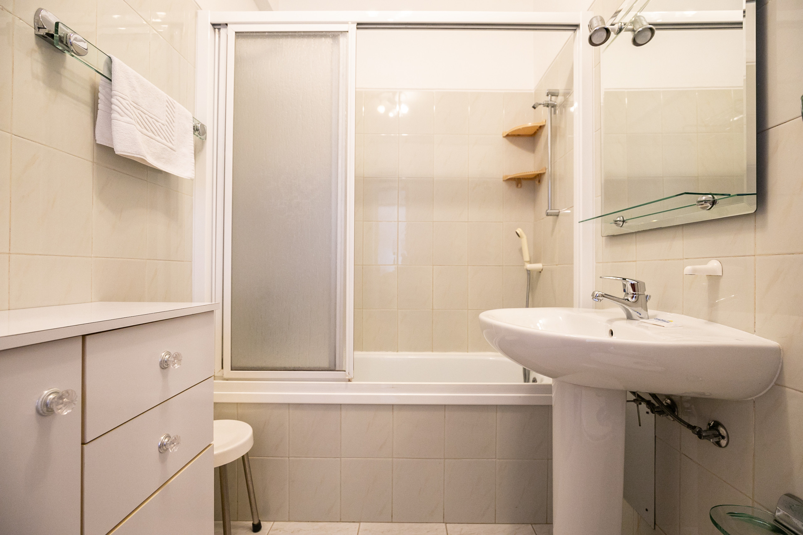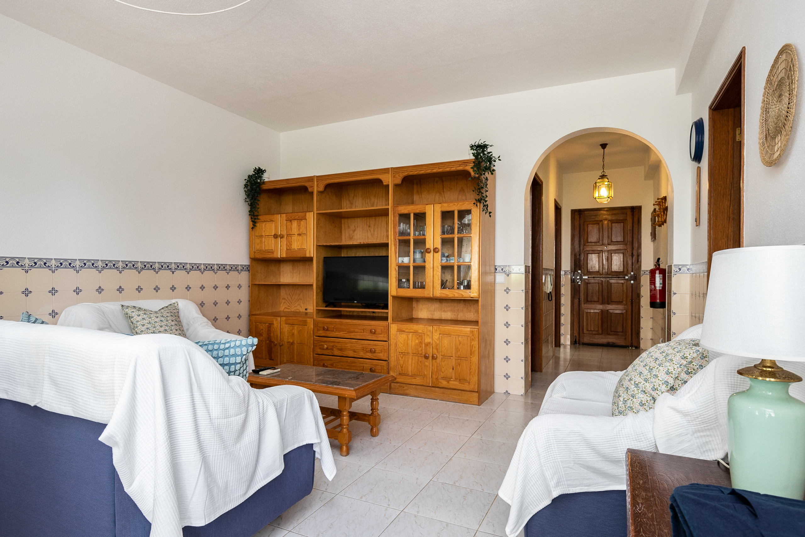 El apartamento está compuesto por un hall de entrada, dos habitaciones con camas de matrimonio, un baño completo con bañera, un amplio y luminoso salón con aire acondicionado y una cocina totalmente equipada. La cocina cuenta con frigorífico combinado, cocina, horno, microondas, tostadora, cafetera (Dolce Gusto), hervidor eléctrico, lavavajillas y lavadora, garantizando todas las comodidades para una estancia práctica y agradable.