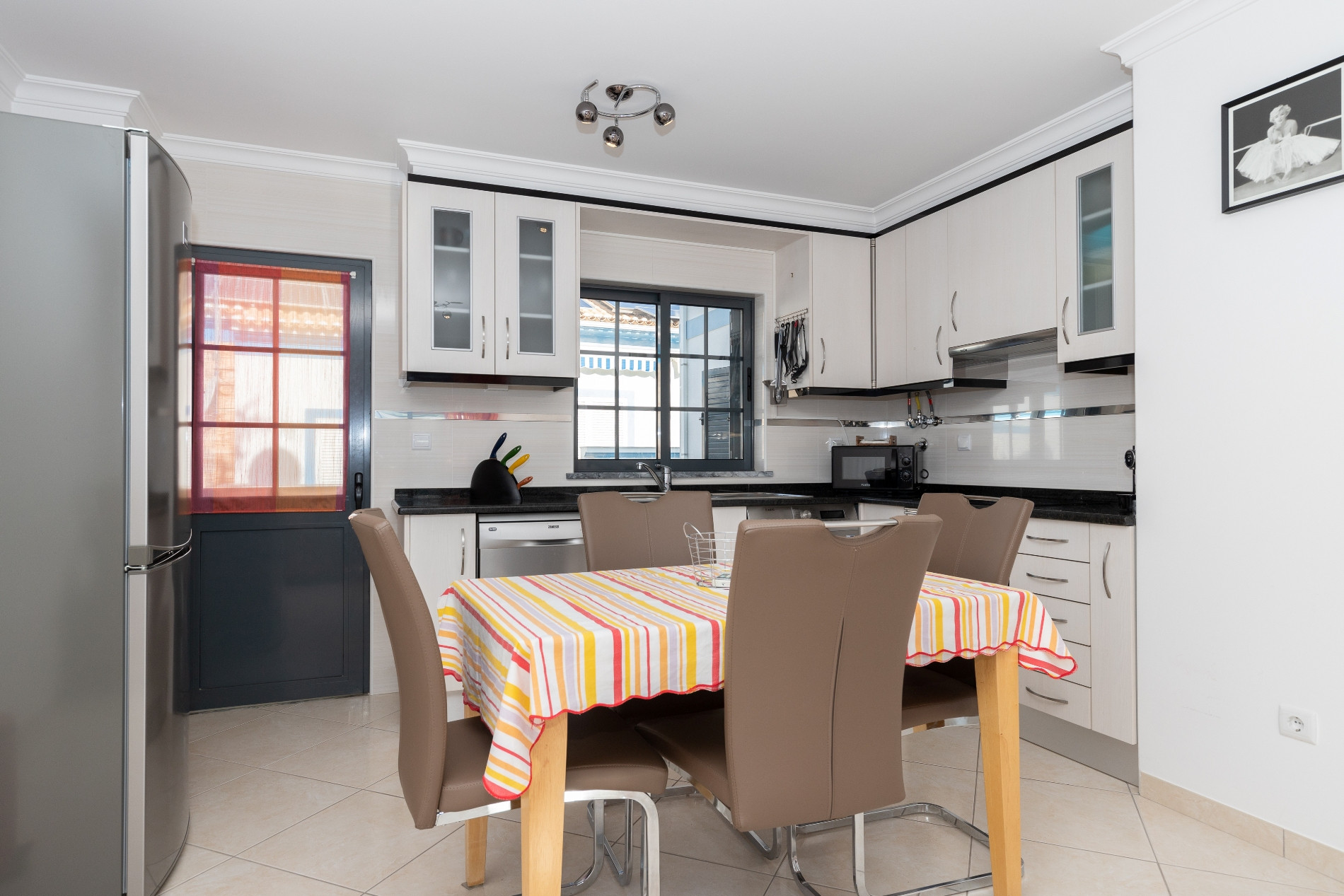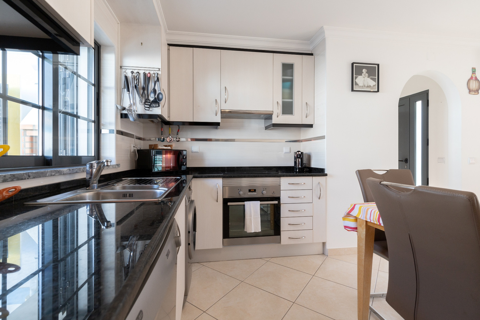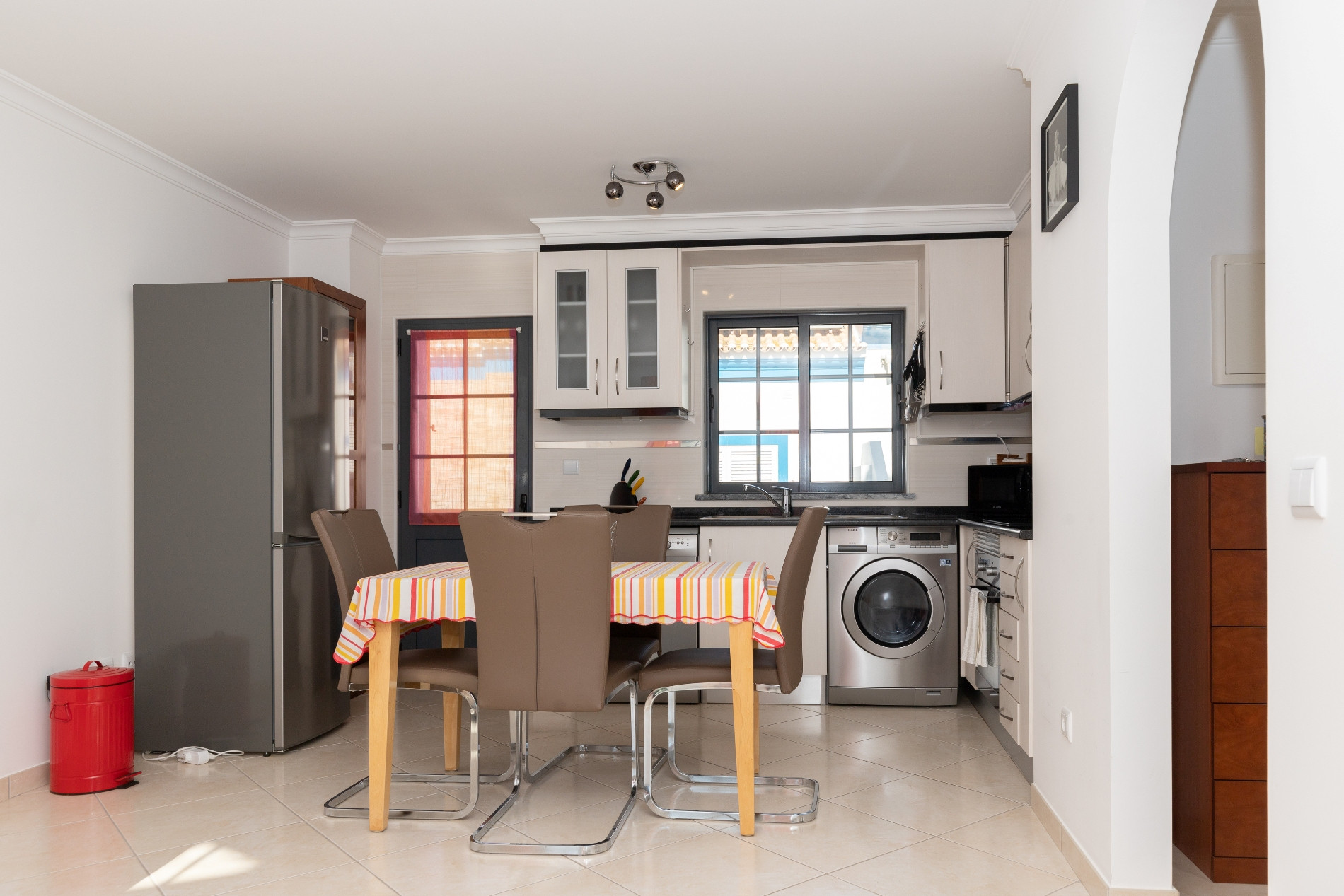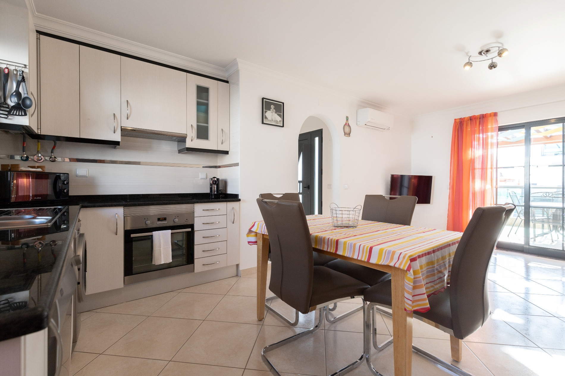 La cocina independiente está totalmente equipada con frigorífico combinado, placa eléctrica, horno, microondas, tostadora, lavavajillas, lavadora y cafetera (Dolce Gusto), ofreciendo todas las comodidades necesarias para preparar deliciosas comidas. El apartamento cuenta con aire acondicionado en todos los espacios, internet Wi-Fi gratuito y televisión.