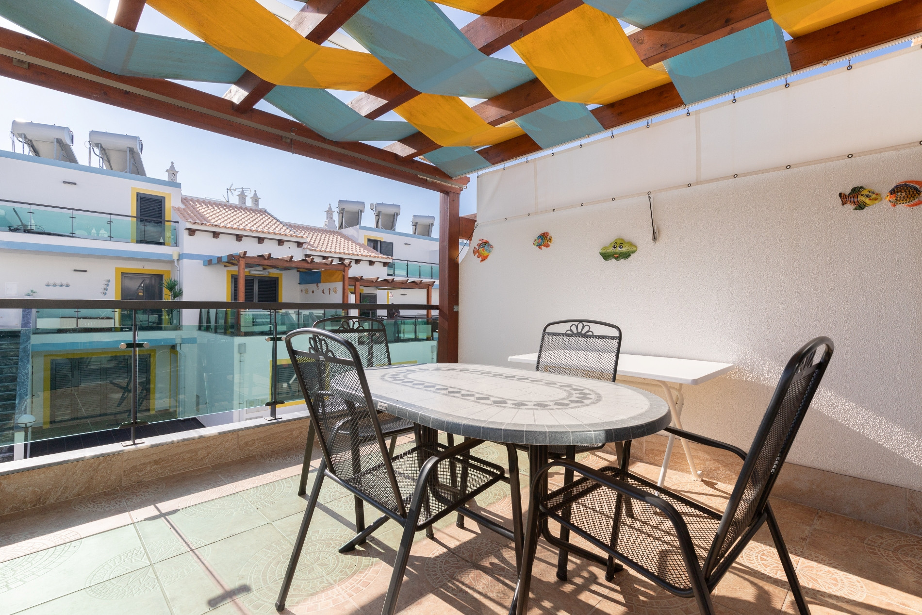 En la segunda planta, el apartamento cuenta con dos habitaciones más: una con cama de matrimonio y otra con cama de matrimonio y cama individual, un cuarto de baño con ducha y acceso a dos terrazas con vistas al complejo, proporcionando aún más espacio exterior y privacidad.