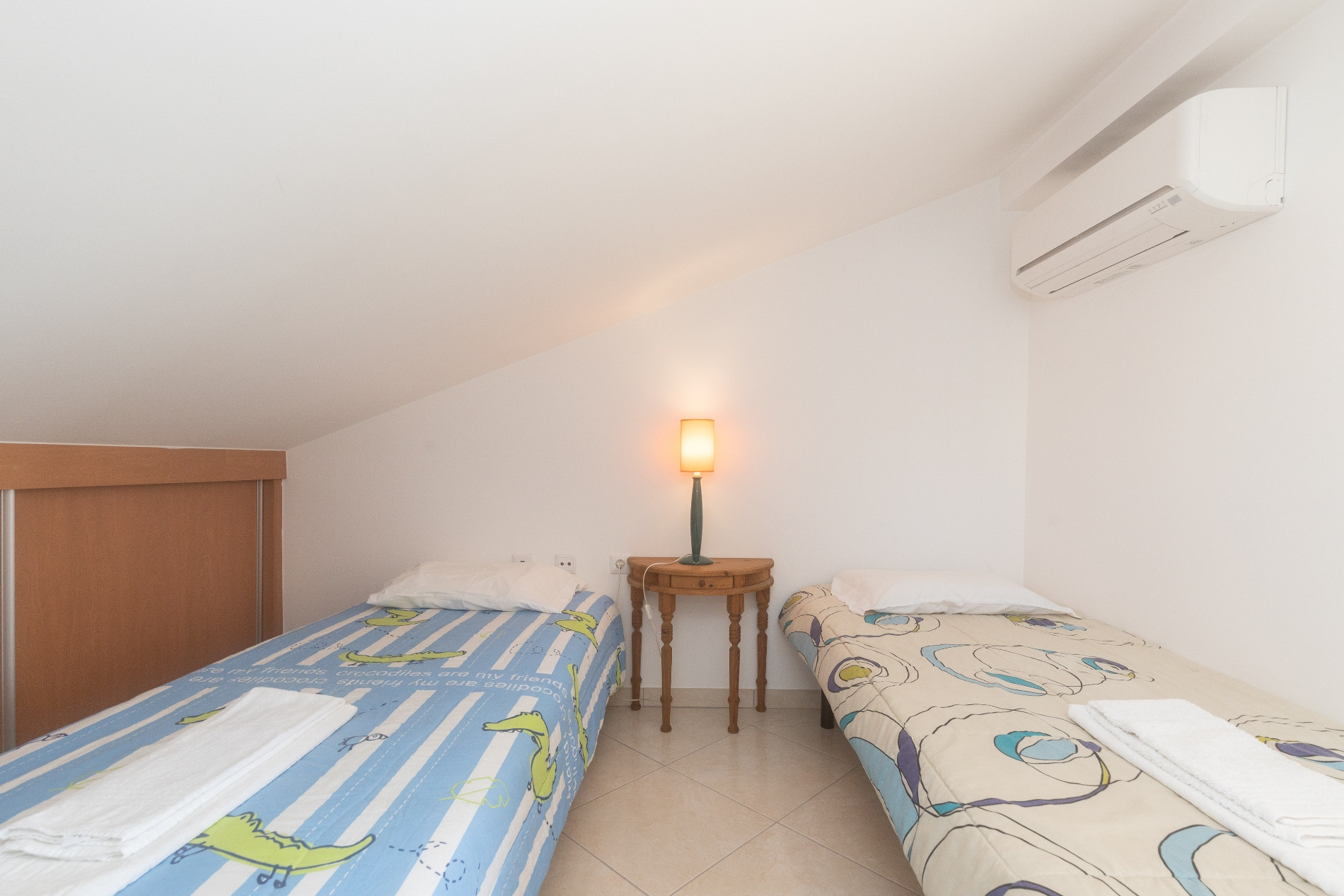 Distribuido por dos pisos, el apartamento dispone, en la primera planta, de un acogedor hall de entrada, una habitación con cama de matrimonio, un cuarto de baño con bañera y una amplia sala de estar y comedor en espacio abierto con cocina totalmente equipada. Esta área social se abre a dos agradables patios: uno al norte, con barbacoa y conexión directa a la cocina, y otro al sur, con toldo, mesa y sillas — perfecto para comidas al aire libre.