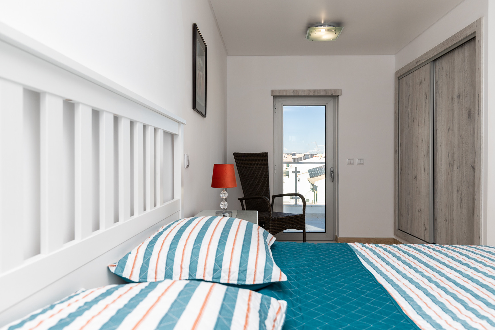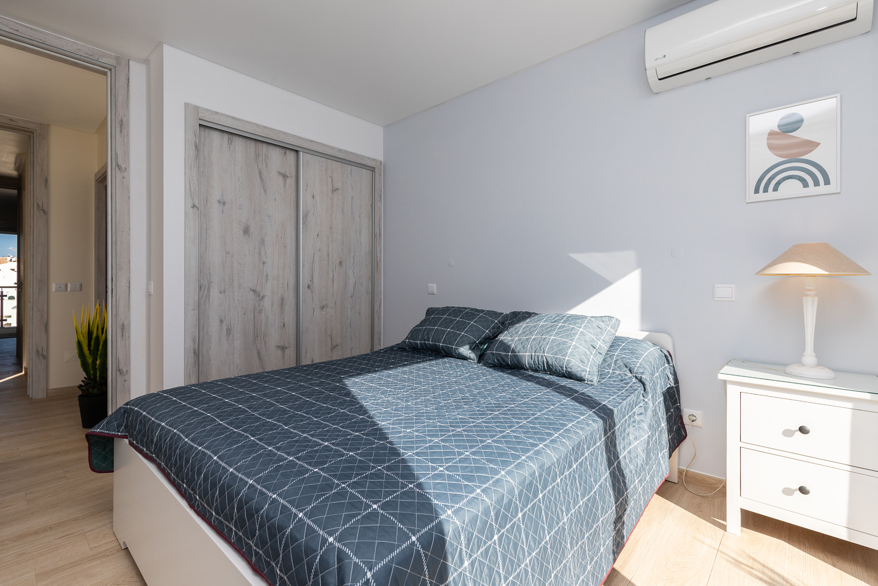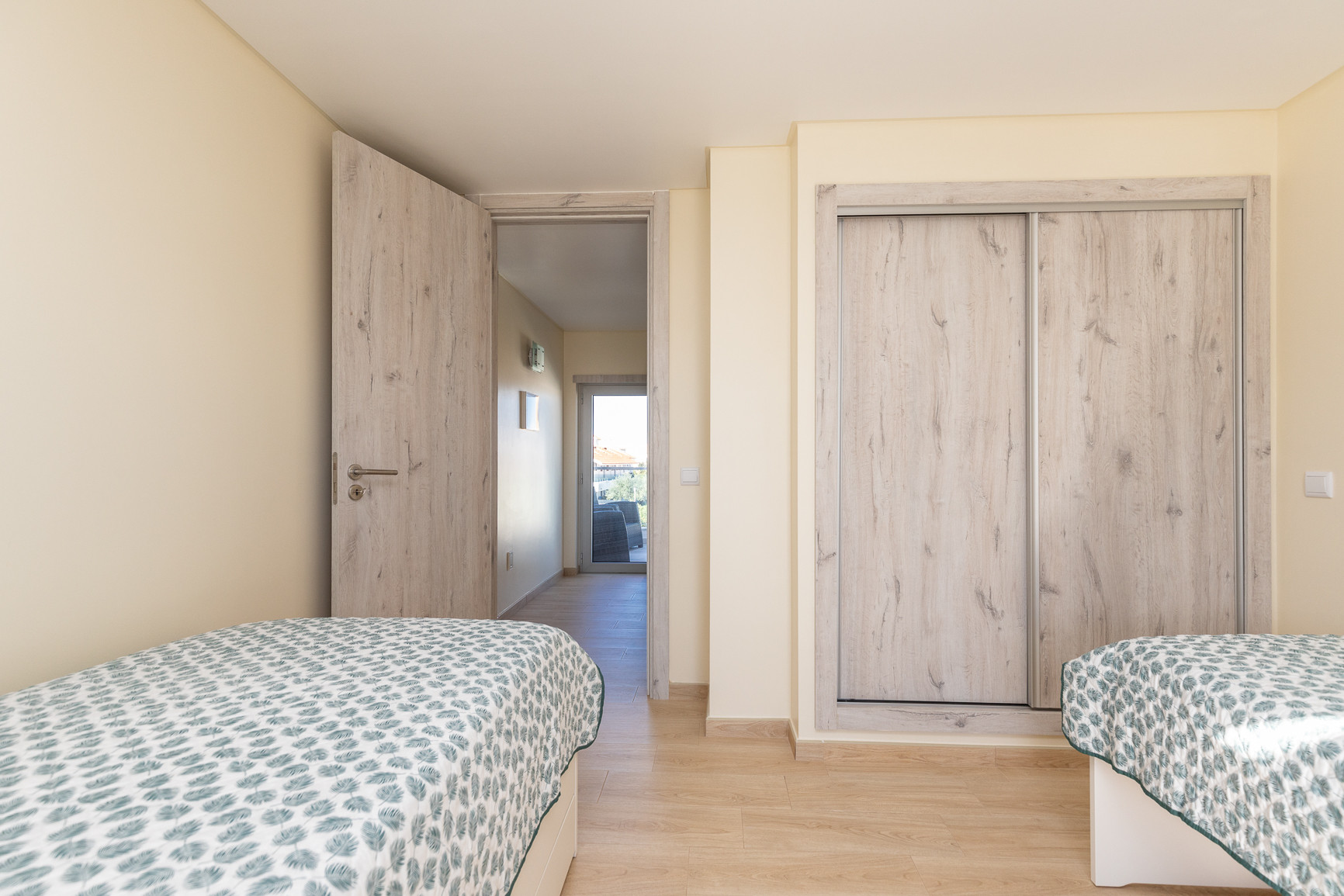 En la segunda planta, el apartamento cuenta con dos habitaciones más: una con cama de matrimonio y otra con cama de matrimonio y cama individual, un cuarto de baño con ducha y acceso a dos terrazas con vistas al complejo, proporcionando aún más espacio exterior y privacidad.