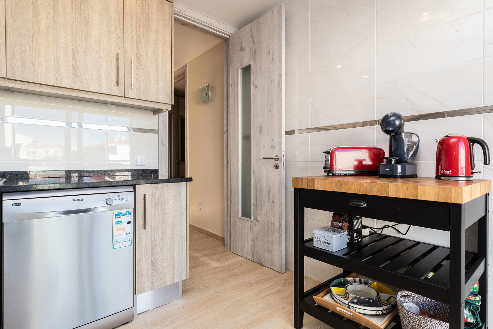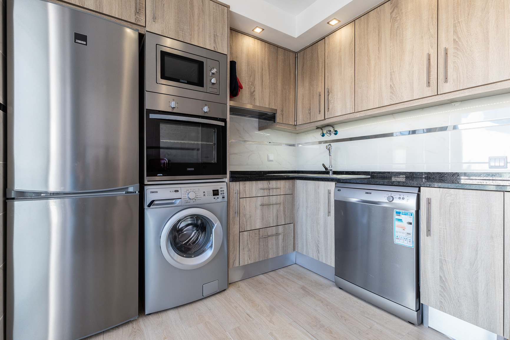 La cocina independiente está totalmente equipada con frigorífico combinado, placa eléctrica, horno, microondas, tostadora, lavavajillas, lavadora y cafetera (Dolce Gusto), ofreciendo todas las comodidades necesarias para preparar deliciosas comidas. El apartamento cuenta con aire acondicionado en todos los espacios, internet Wi-Fi gratuito y televisión.
