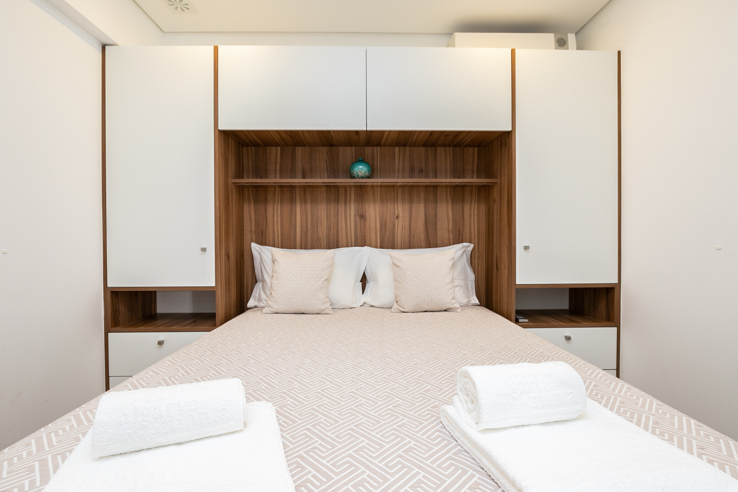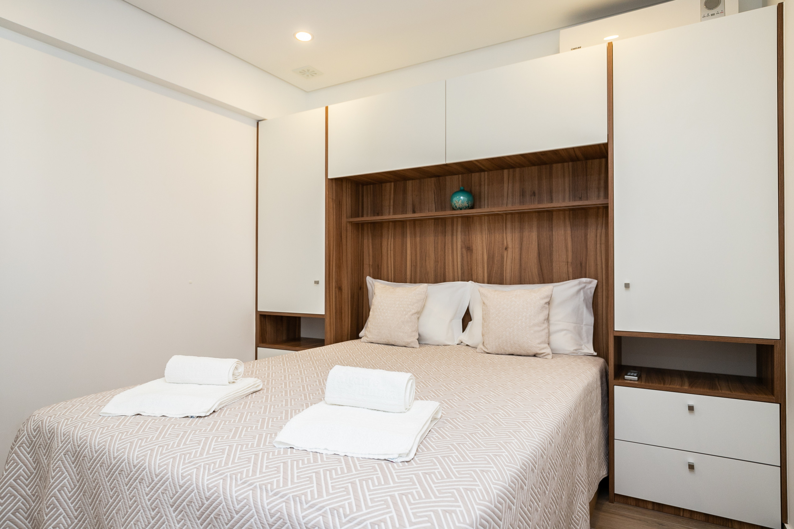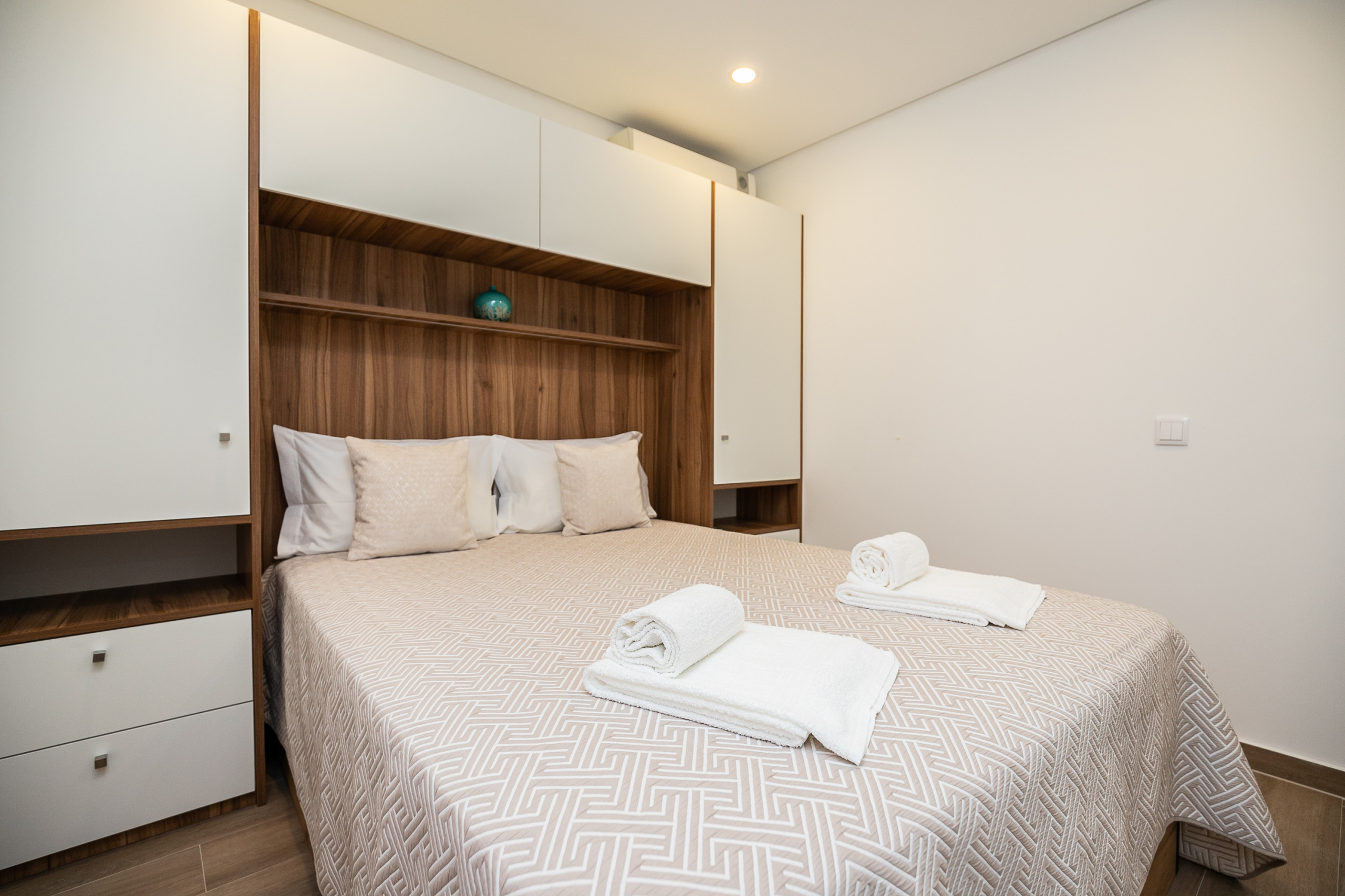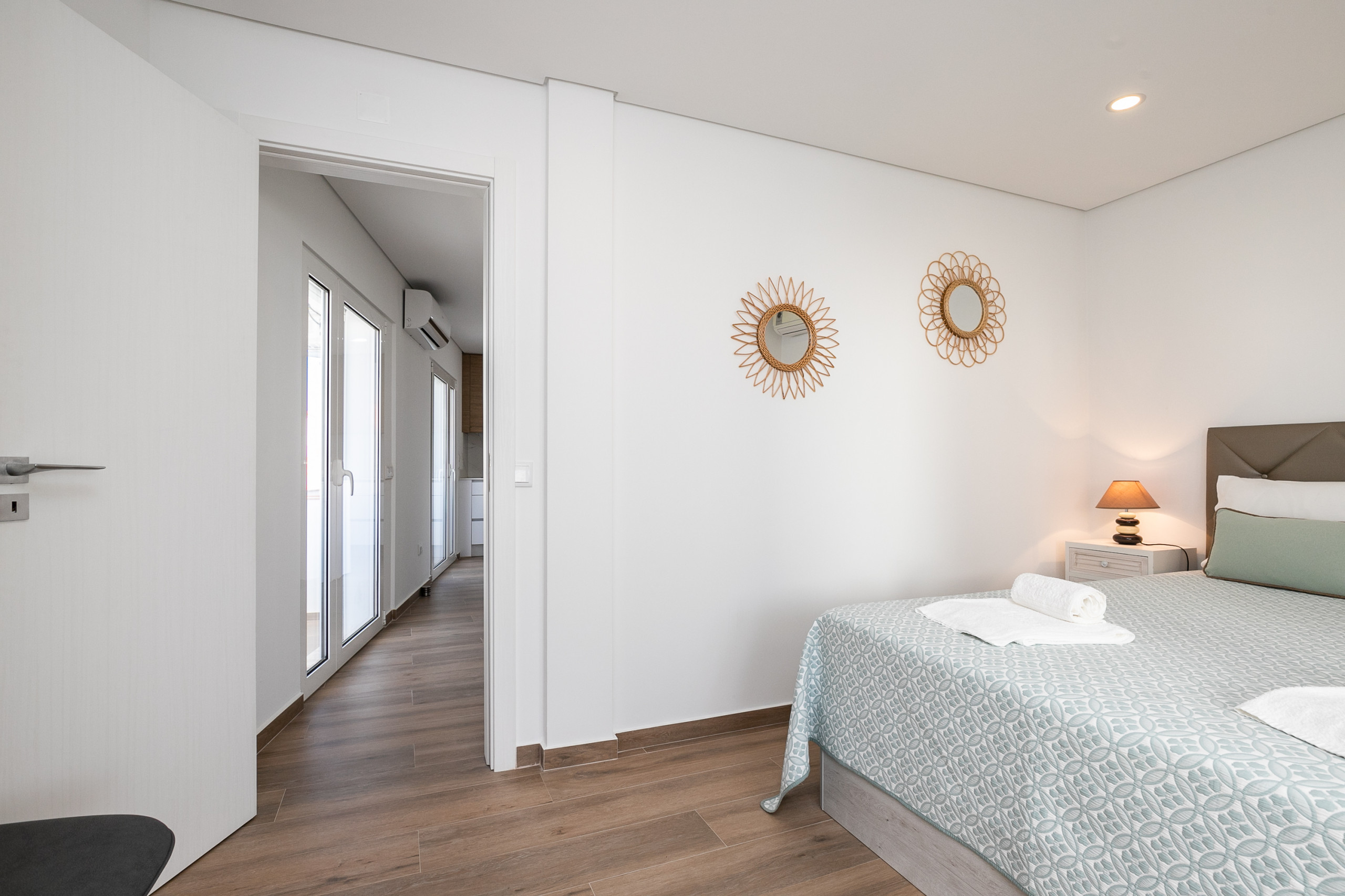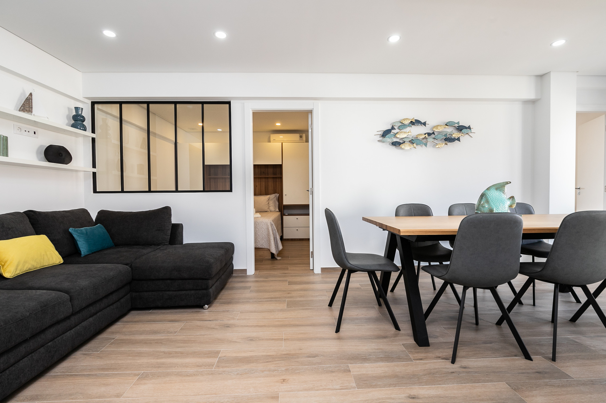 El apartamento cuenta con una habitación cómoda equipada con una cama de matrimonio y un sofá-cama, permitiendo alojar cómodamente hasta 4 personas. La luminosidad y el diseño moderno crean un ambiente acogedor y relajante, perfecto para descansar después de un día de playa o exploración.