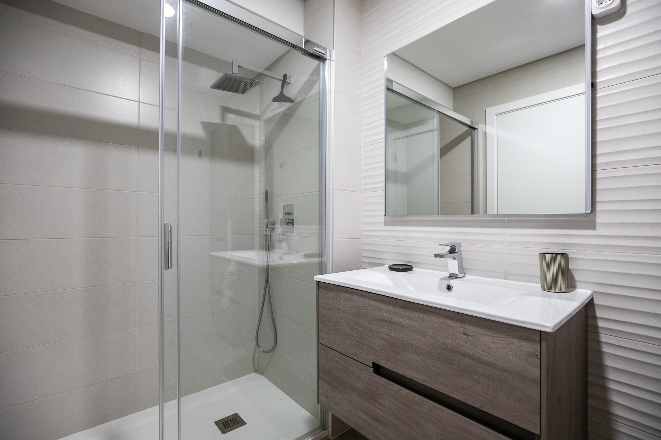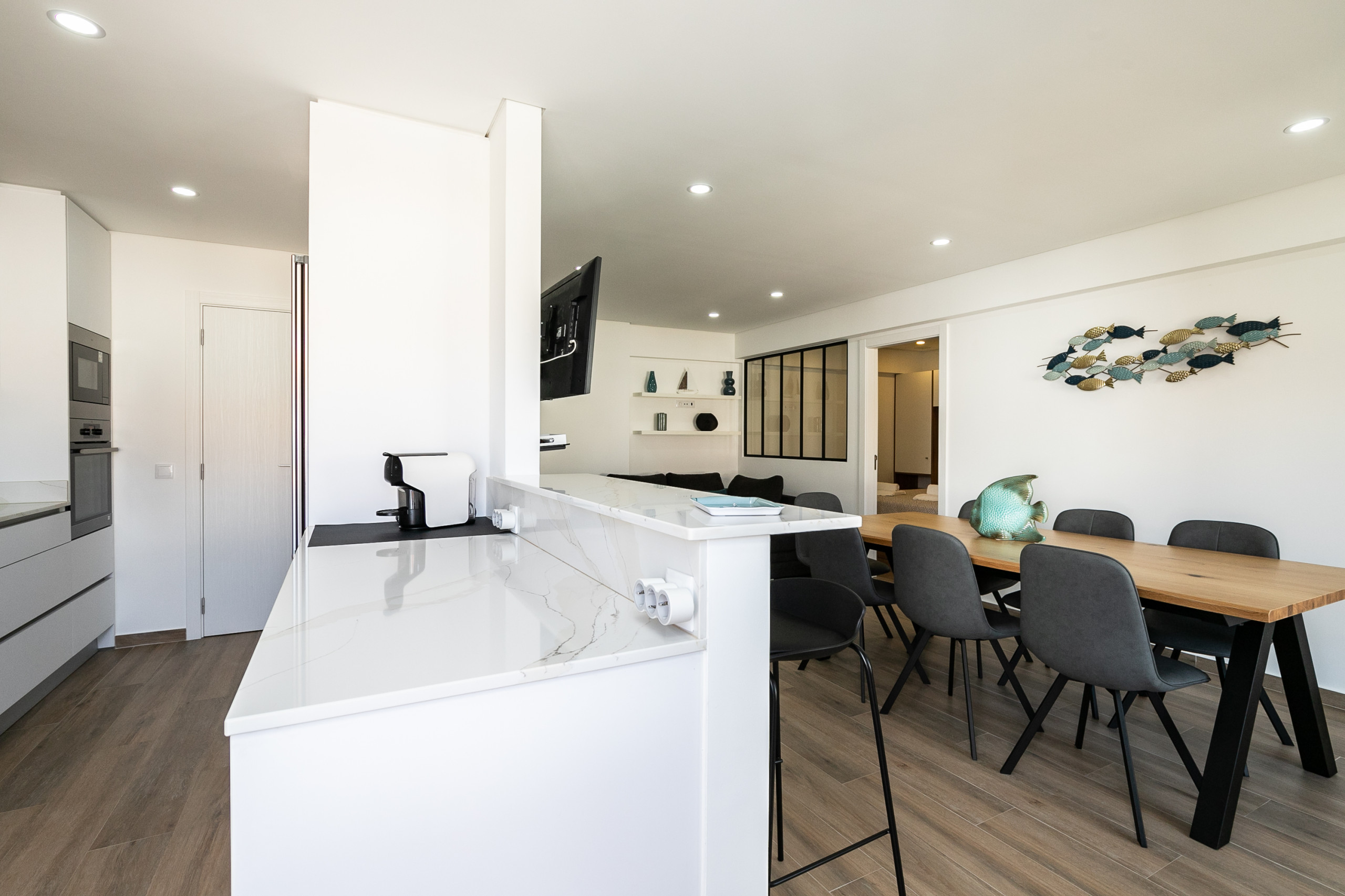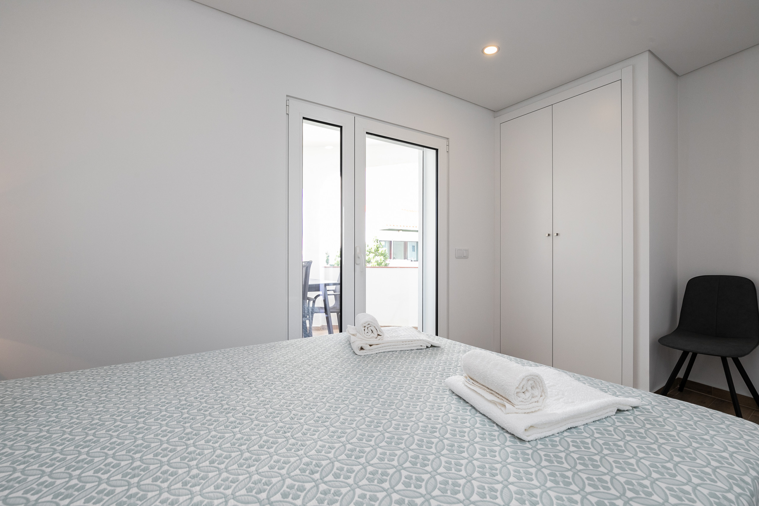 El apartamento cuenta con dos habitaciones espaciosas, ambas con camas de matrimonio, ideal para alojar cómodamente hasta 4 personas. La luminosidad y el diseño moderno crean un ambiente acogedor y relajante. Cuenta con un baño completo con ducha, perfecto para refrescarse después de un día en la playa.