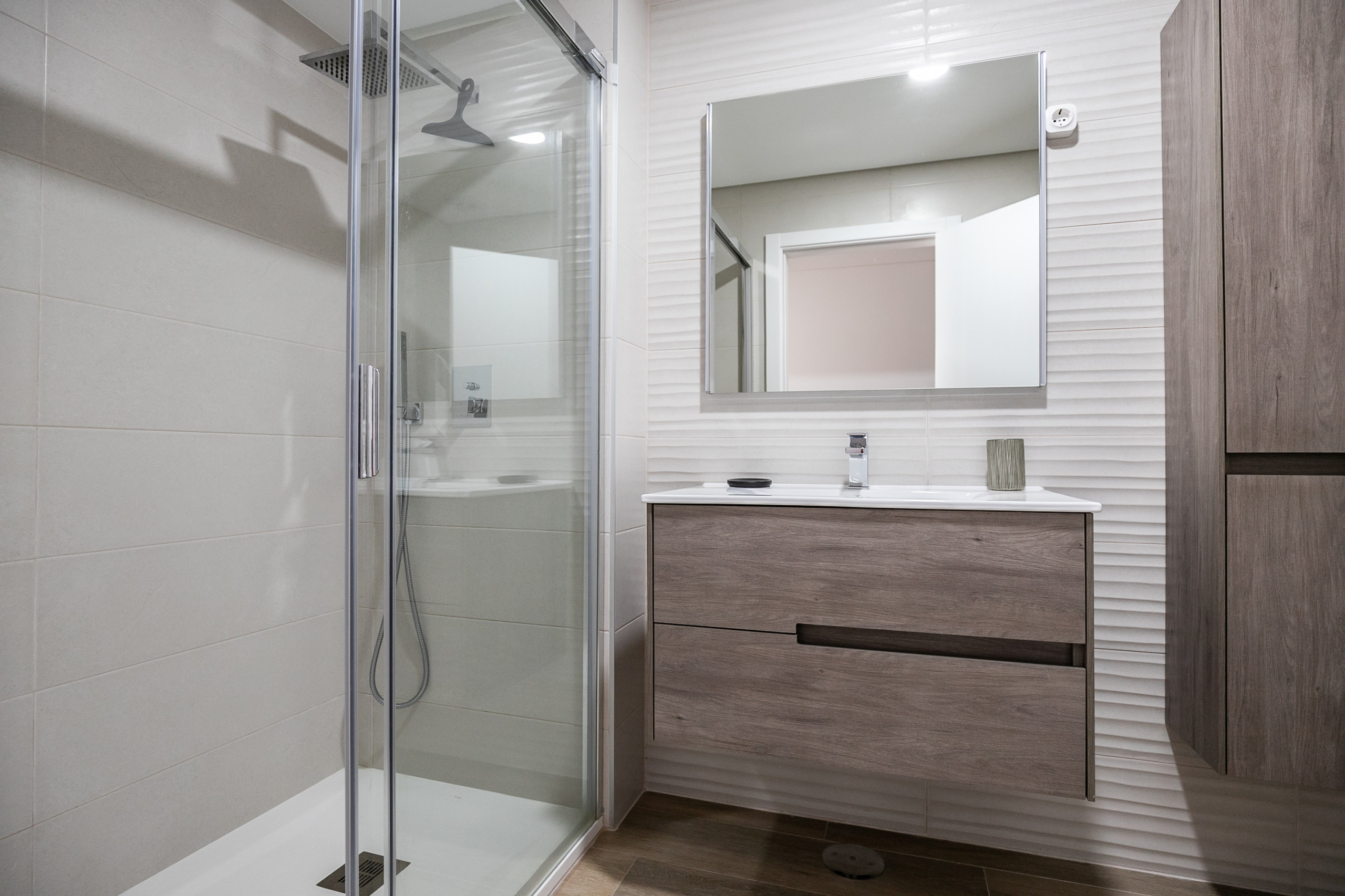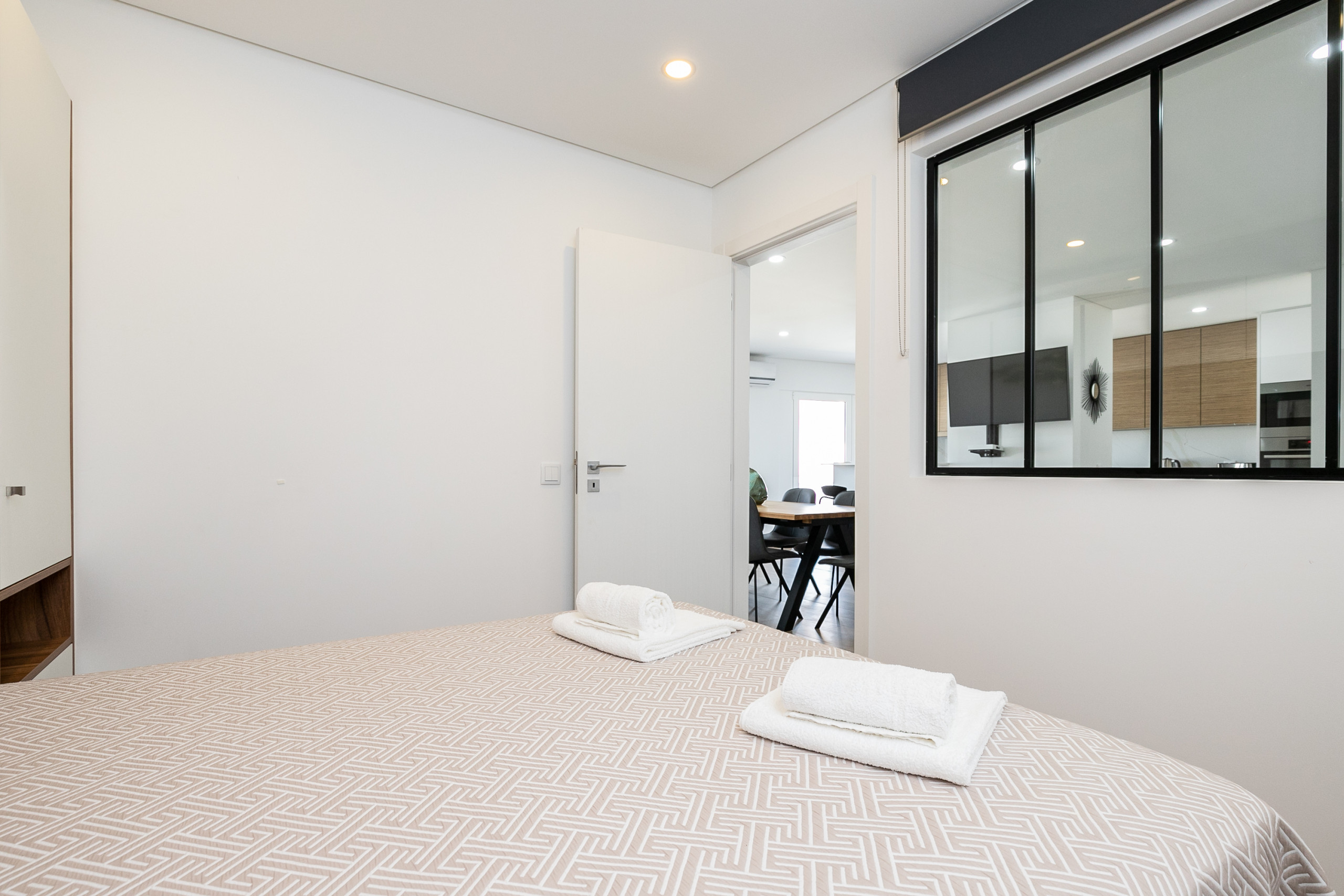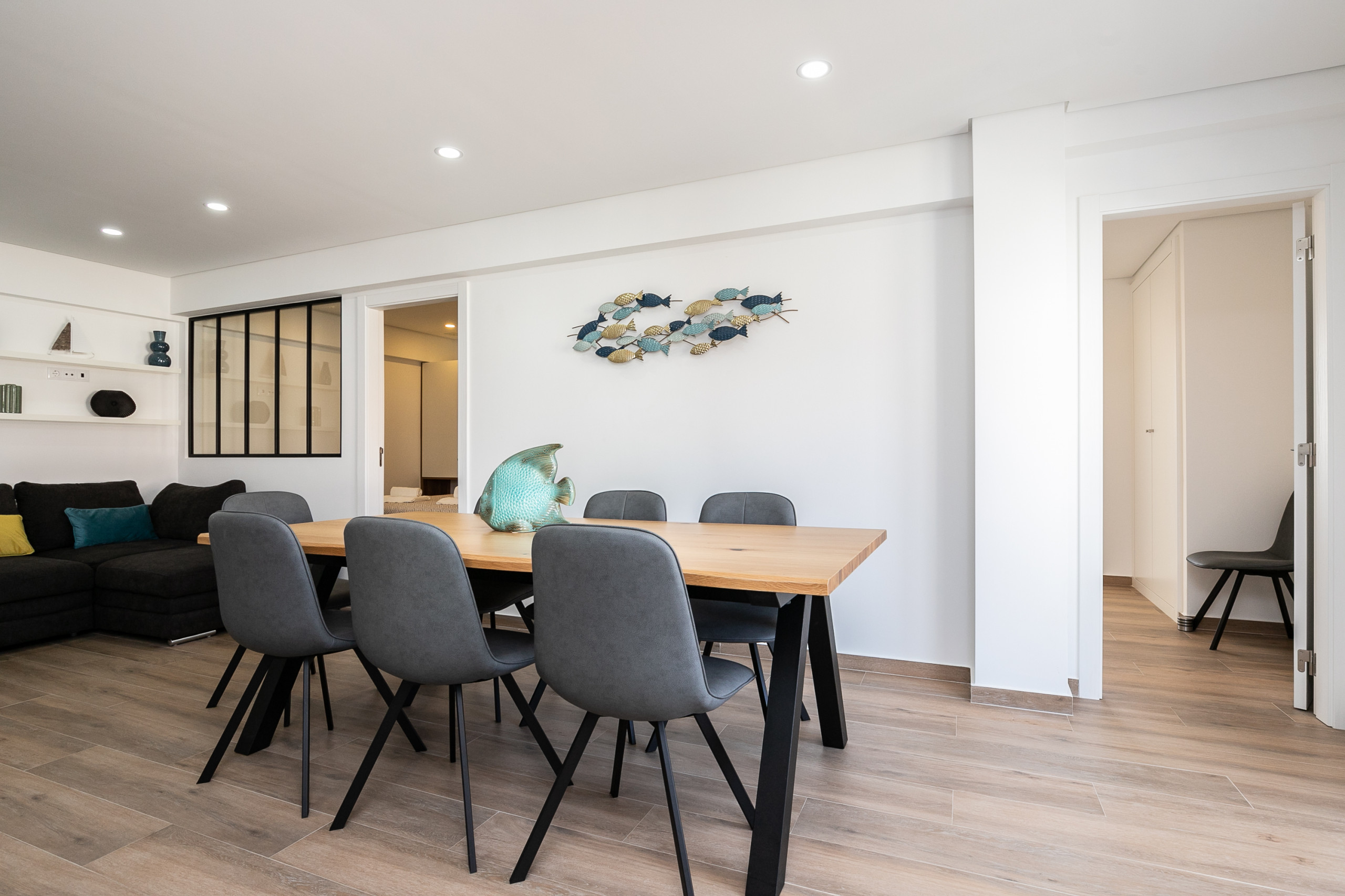 El apartamento cuenta con dos habitaciones espaciosas, ambas con camas de matrimonio, ideal para alojar cómodamente hasta 4 personas. La luminosidad y el diseño moderno crean un ambiente acogedor y relajante. Cuenta con un baño completo con ducha, perfecto para refrescarse después de un día en la playa.