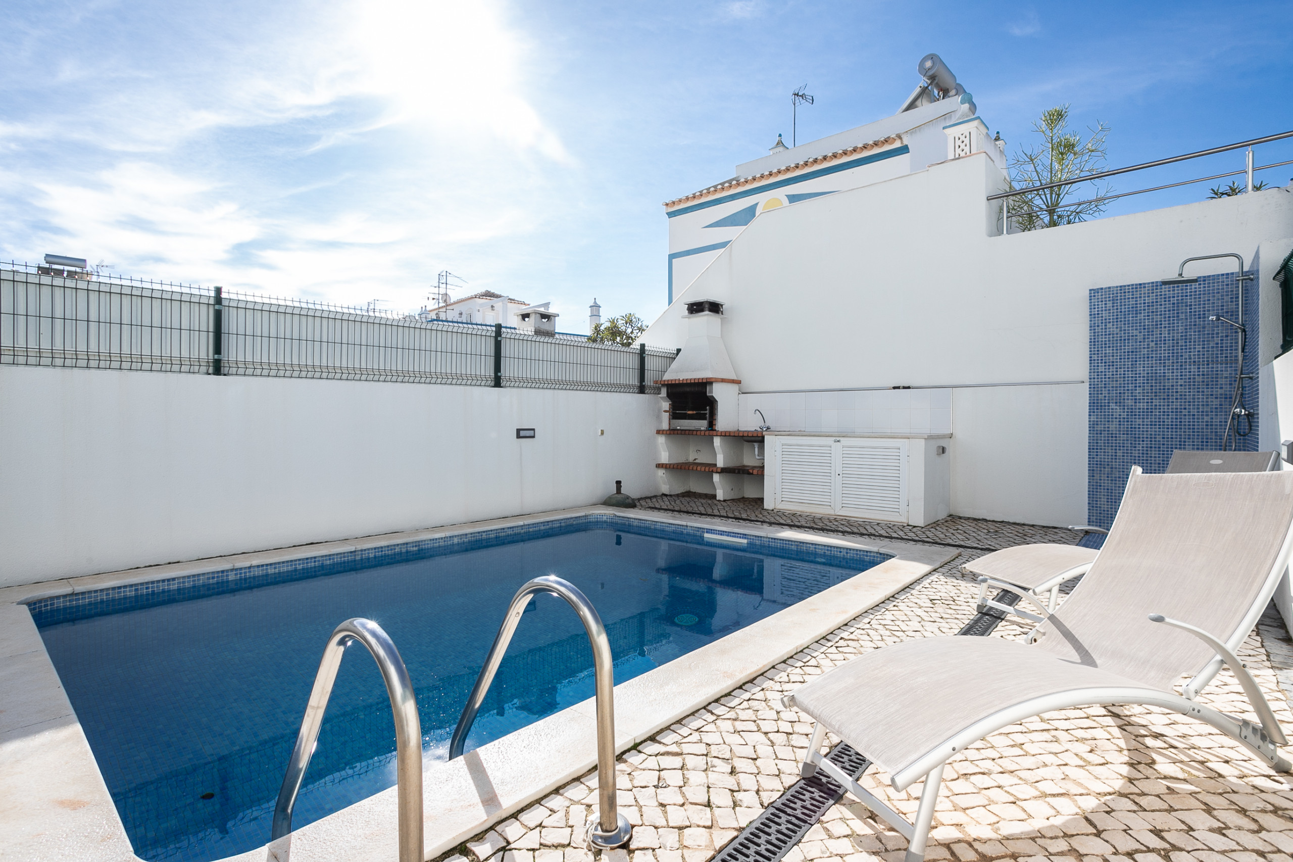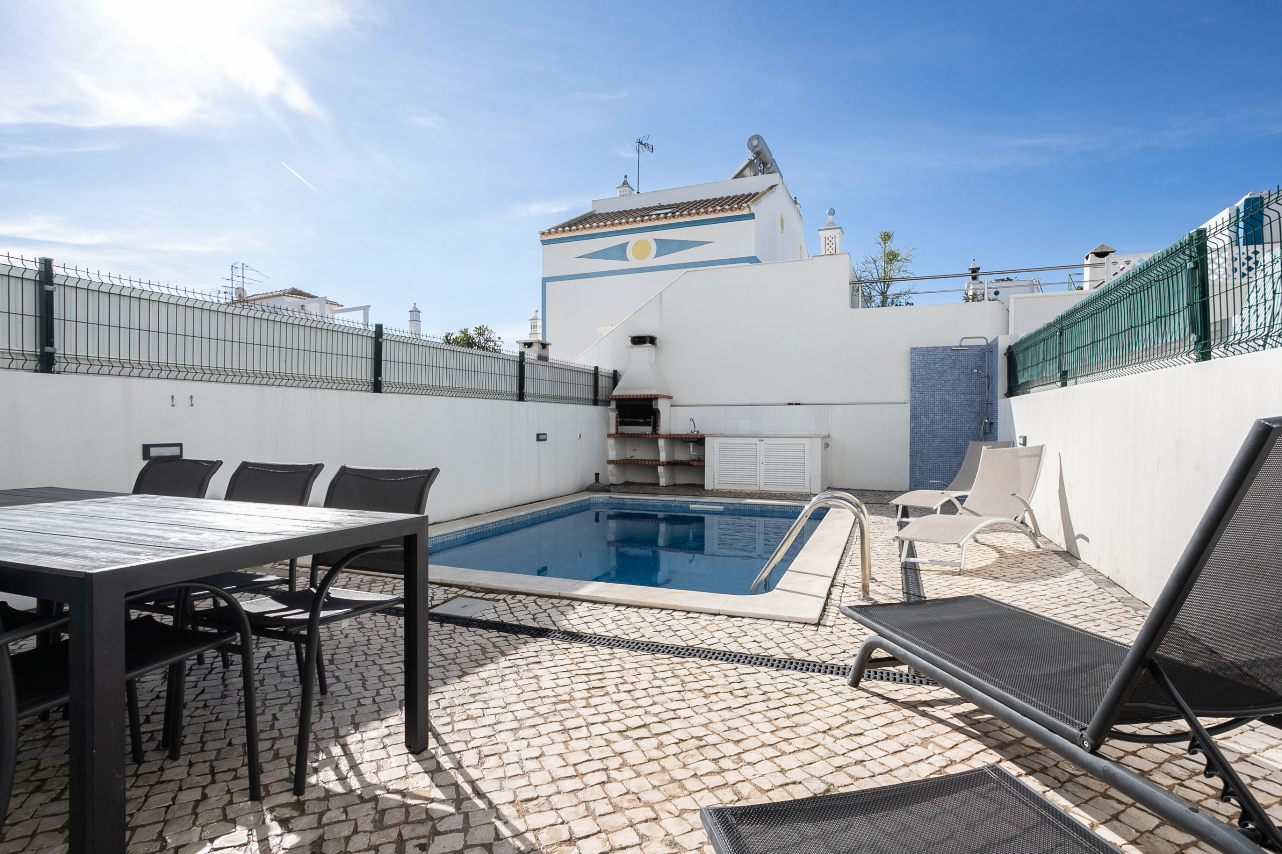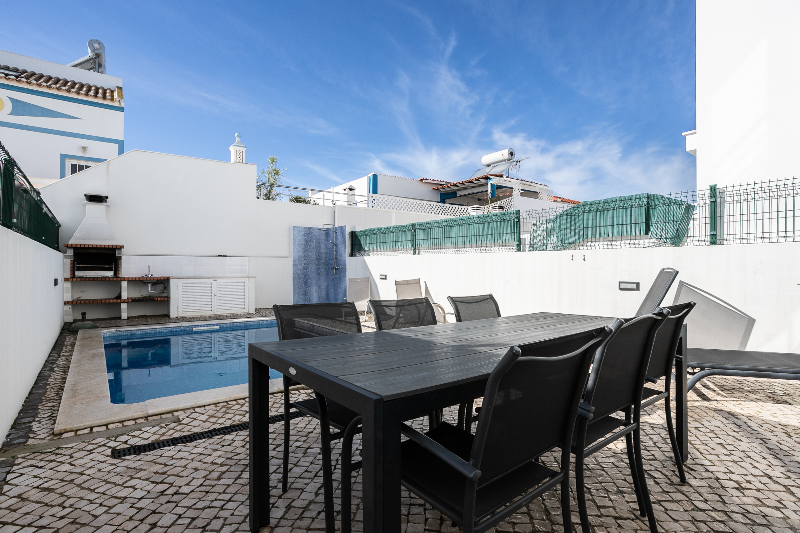 El espacio exterior maximiza la vida al aire libre, con una piscina privada orientada al oeste, tumbonas para relajarse al sol, y una zona cubierta con toldo, equipada con mesa, sillas y barbacoa para comidas al aire libre. Una terraza adicional de 20m² con mobiliario de jardín proporciona más espacio para disfrutar del clima del Algarve. La vivienda dispone además de estacionamiento privativo para hasta 2 vehículos dentro de la propiedad.