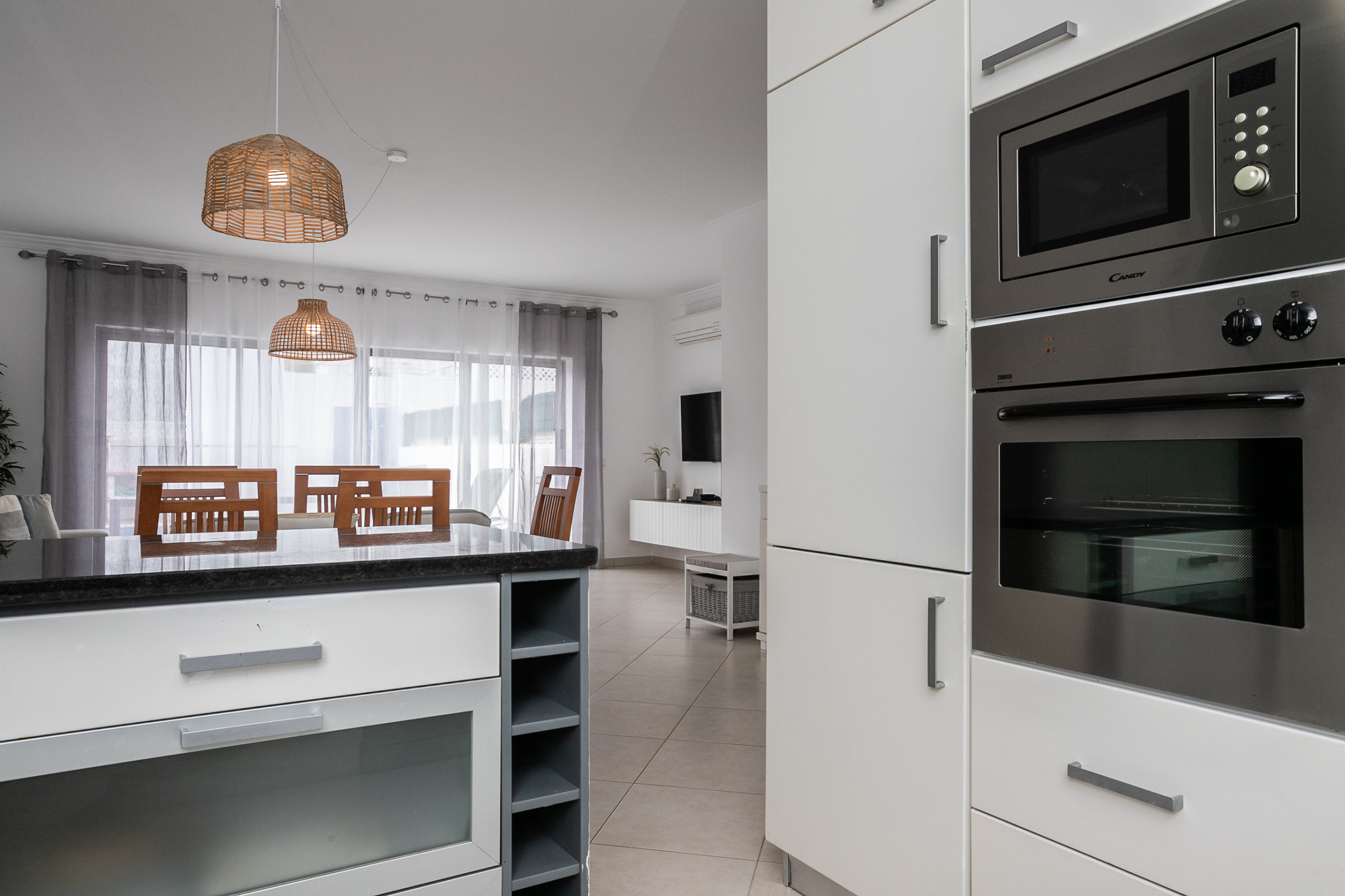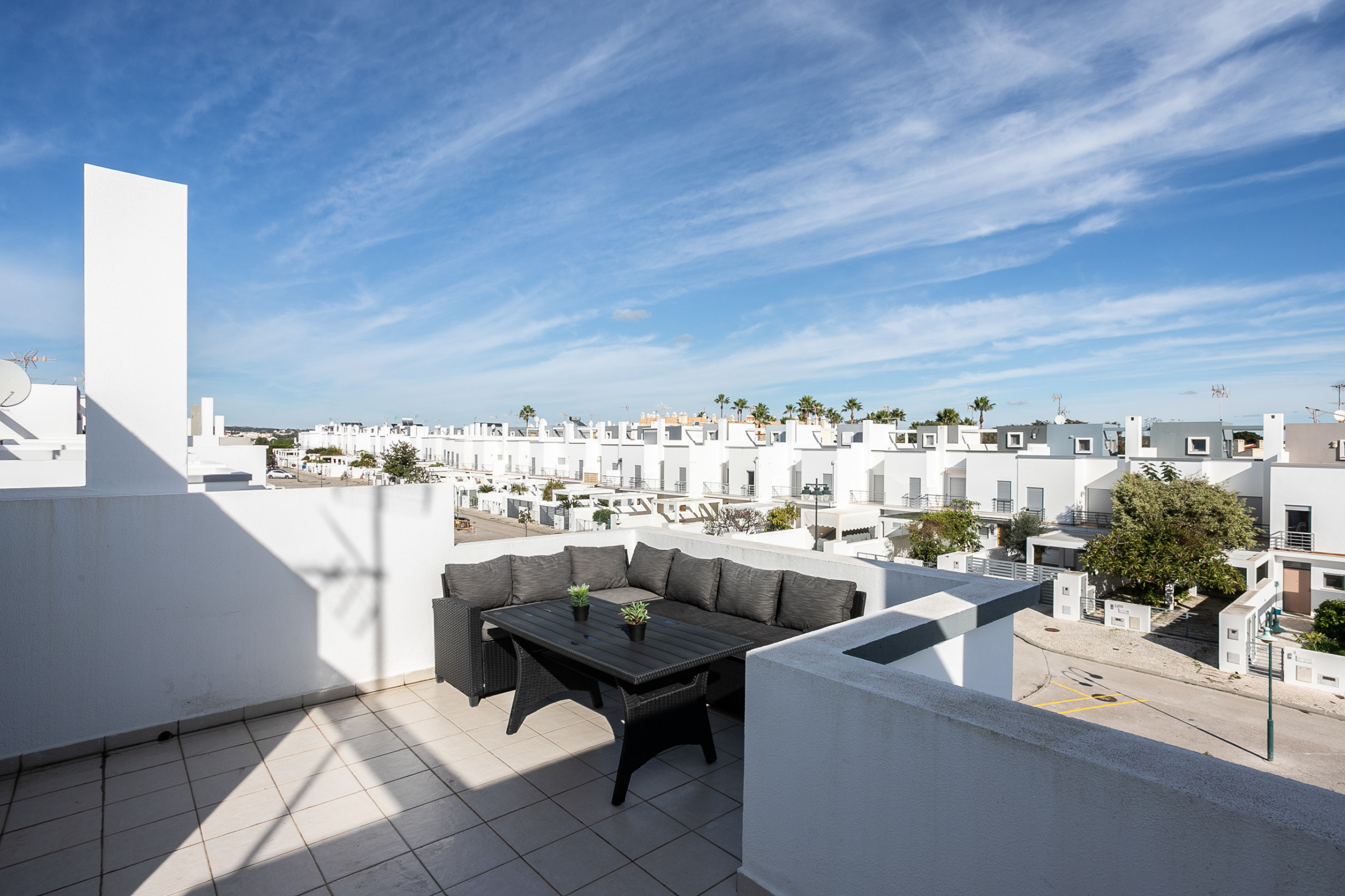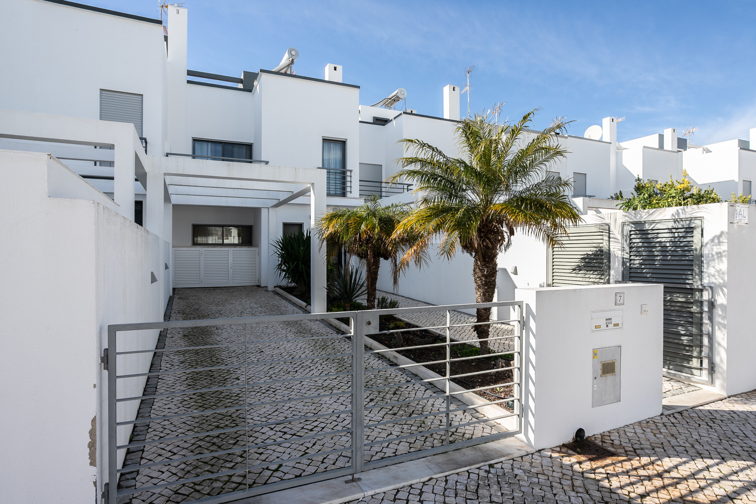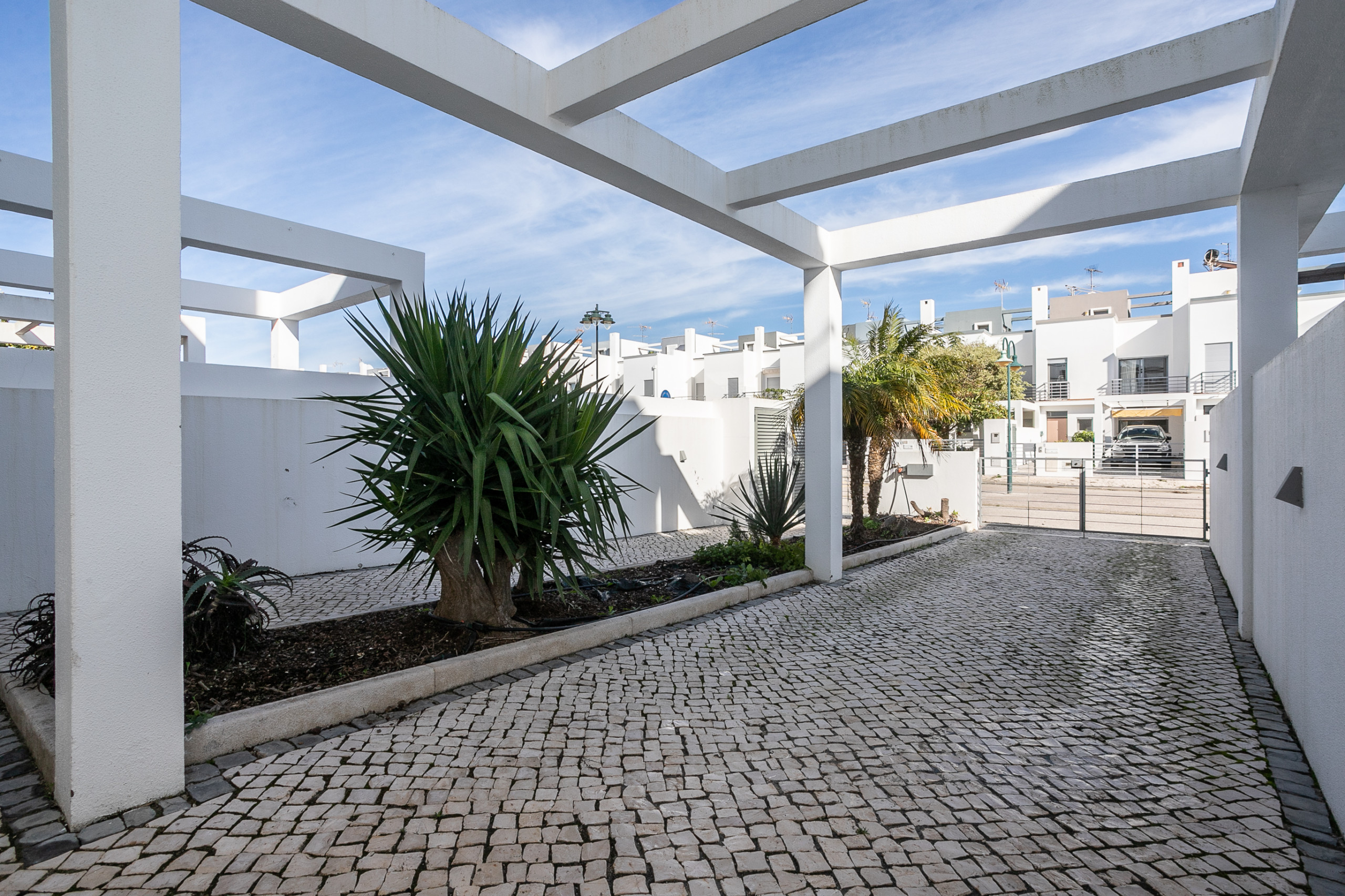 El espacio exterior maximiza la vida al aire libre, con una piscina privada orientada al oeste, tumbonas para relajarse al sol, y una zona cubierta con toldo, equipada con mesa, sillas y barbacoa para comidas al aire libre. Una terraza adicional de 20m² con mobiliario de jardín proporciona más espacio para disfrutar del clima del Algarve. La vivienda dispone además de estacionamiento privativo para hasta 2 vehículos dentro de la propiedad.