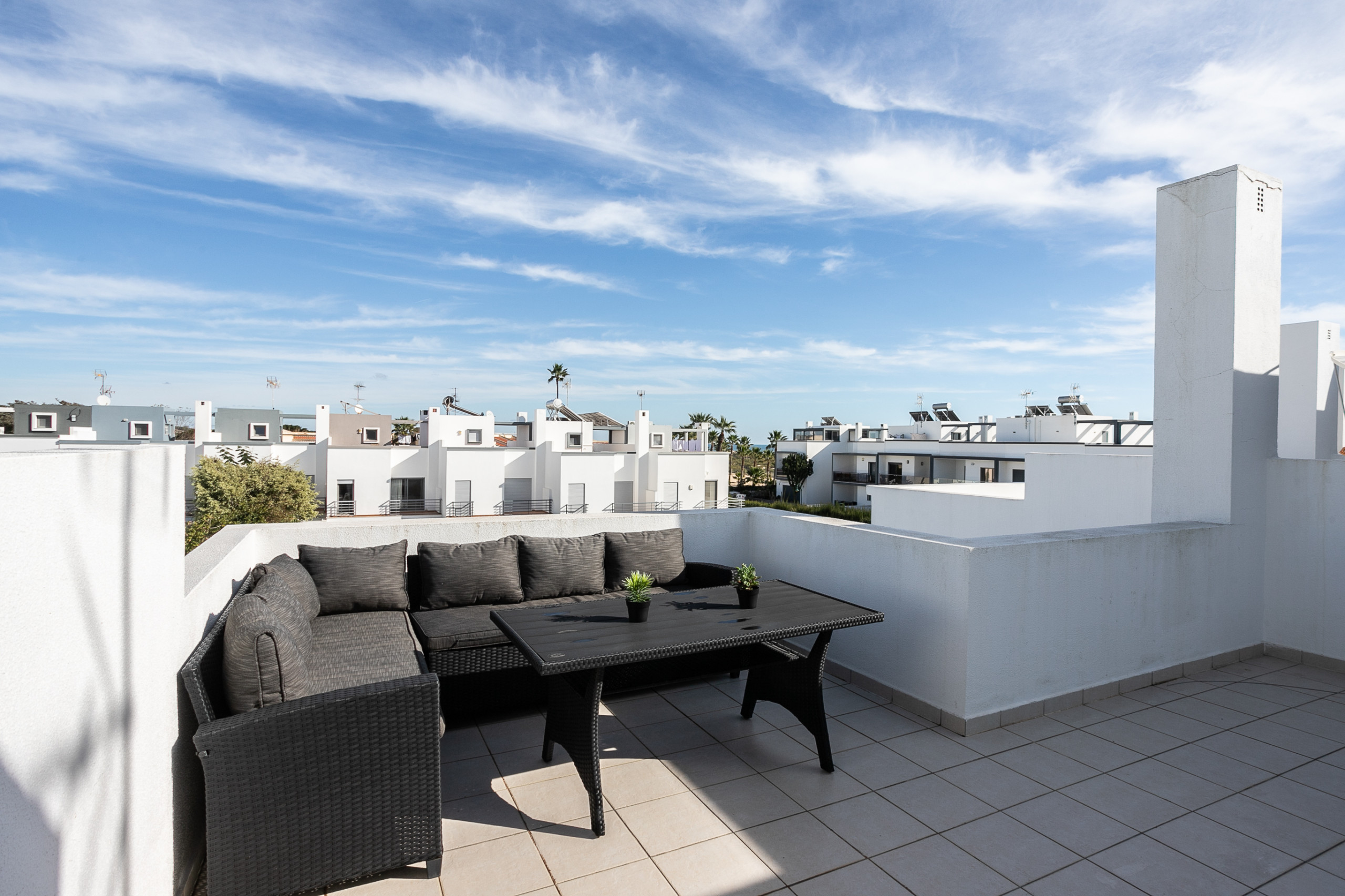 La vivienda cuenta con 3 habitaciones confortables, incluyendo una suite con cama de matrimonio y dos habitaciones con dos camas individuales cada una, todas con armarios empotrados. Dispone de 3 cuartos de baño — dos con ducha y uno con bañera — garantizando privacidad y comodidad para todos los huéspedes. Una de las habitaciones además se beneficia de un balcón orientado al este. En el ático, se encuentra una terraza con el área total de la casa y una fantástica vista al mar, perfecta para apreciar la puesta de sol o relajarse al final del día.