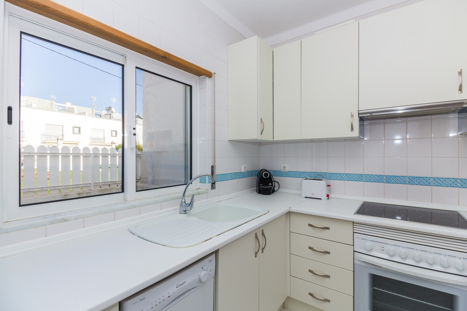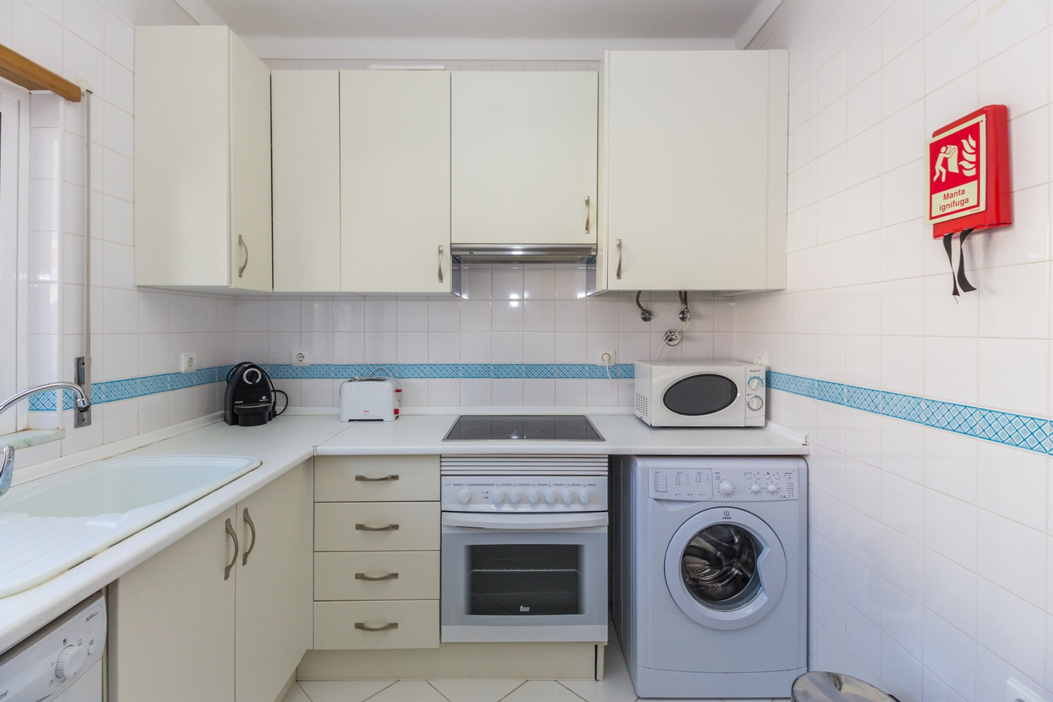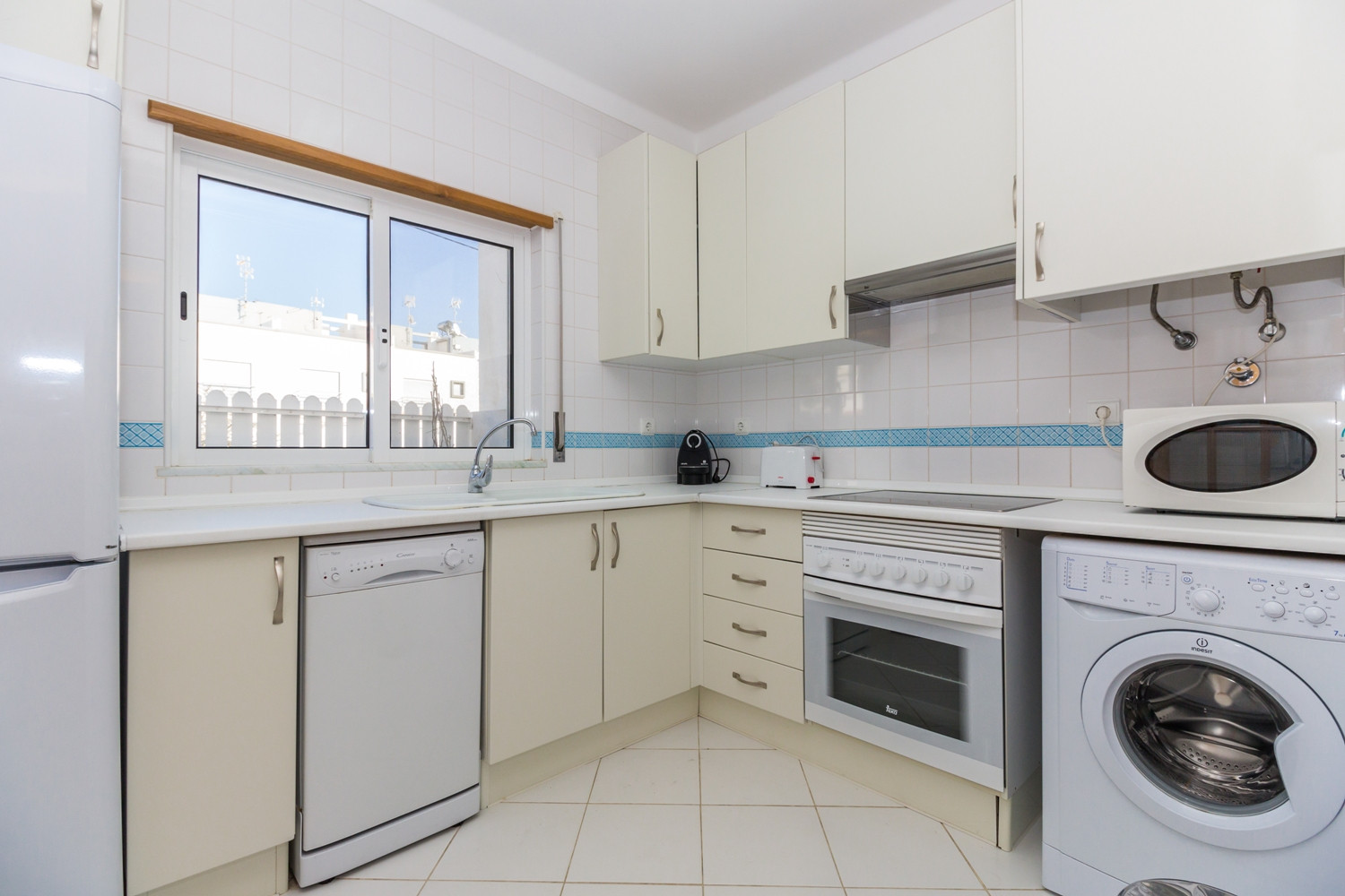 La cocina está equipada con todos los electrodomésticos esenciales, incluyendo frigorífico combinado, placa eléctrica, horno, microondas, tostadora, máquina de café de cápsulas Nespresso, lavavajillas y lavadora, ideal para quien prefiere preparar comidas en casa.