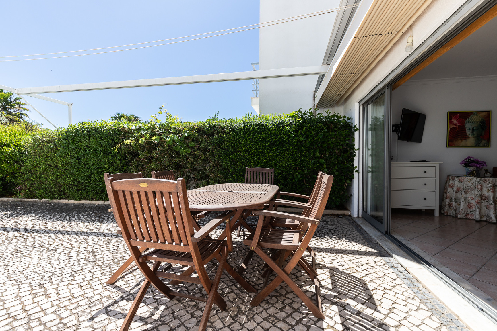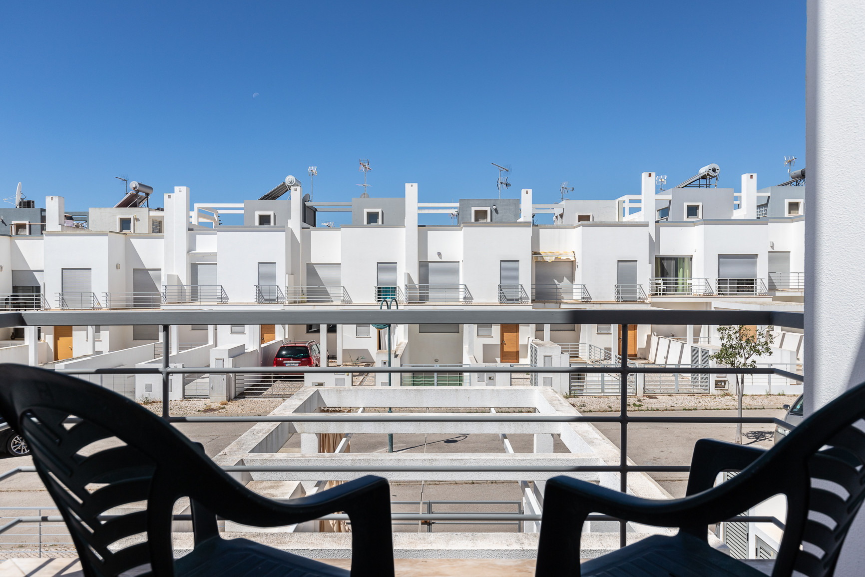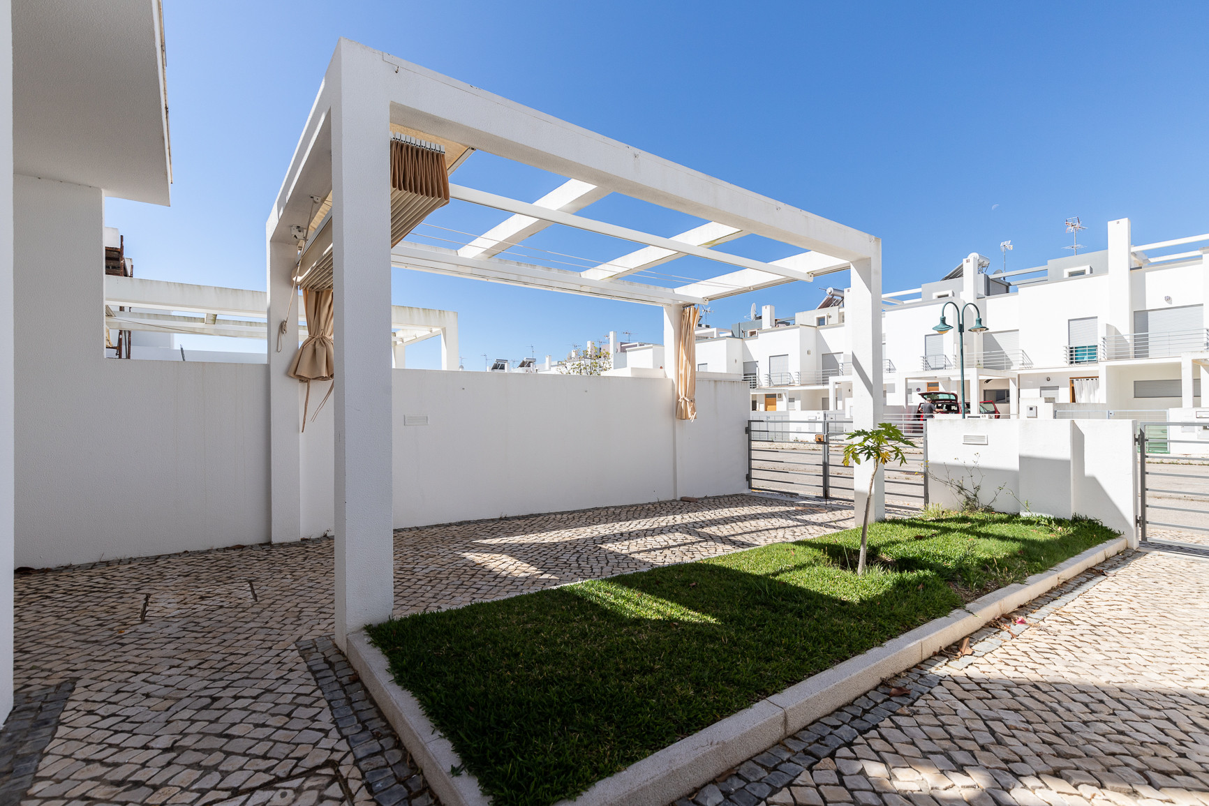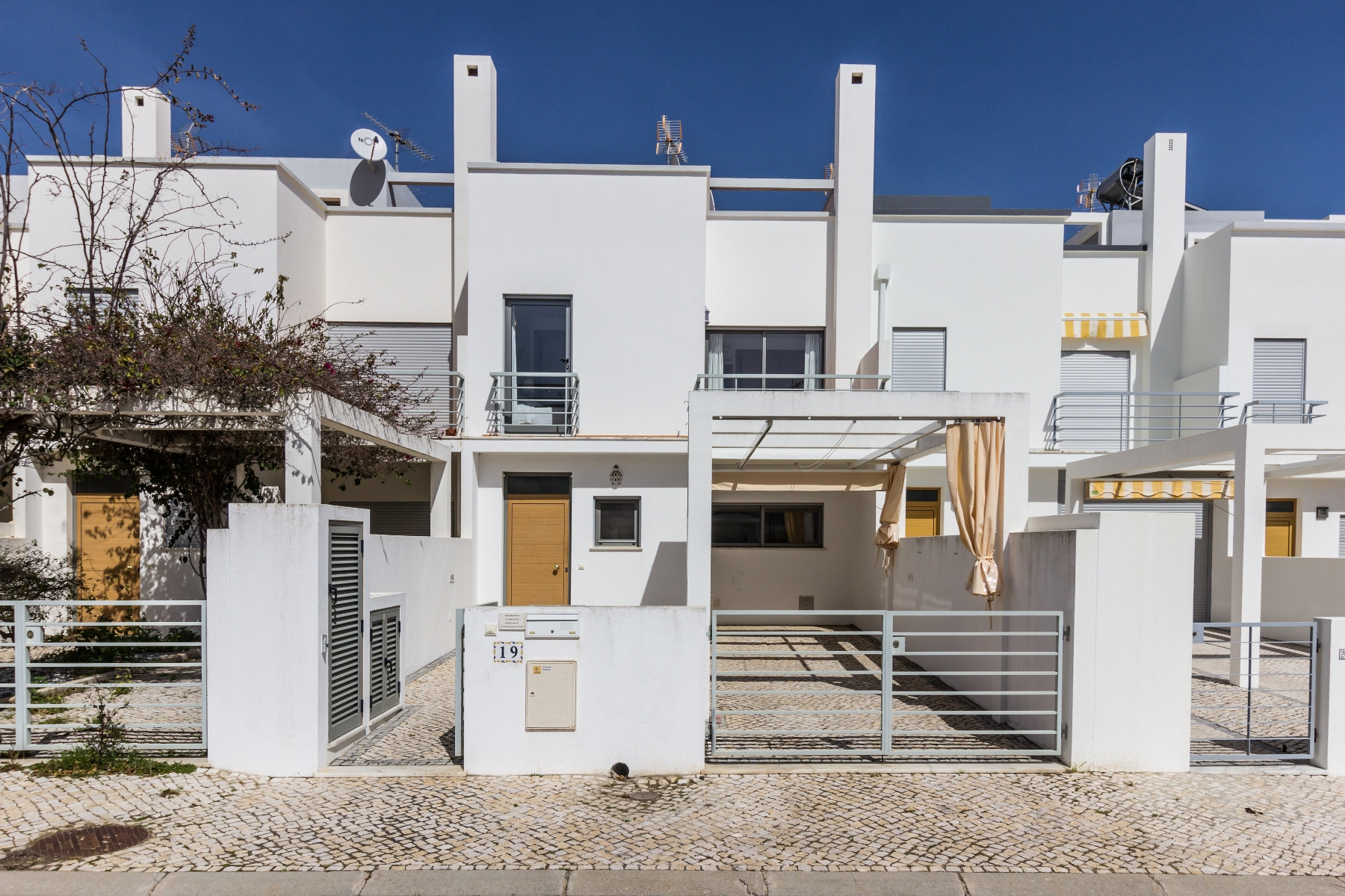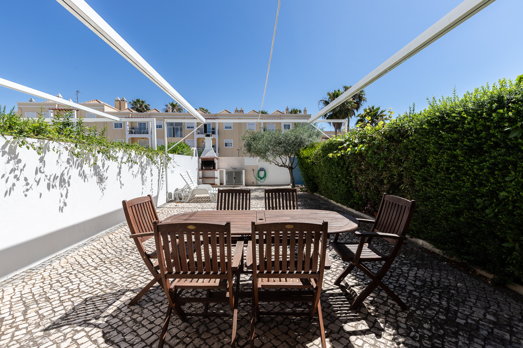 El espacio exterior maximiza la vida al aire libre, con una piscina privada orientada al oeste, tumbonas para relajarse al sol, y una zona cubierta con toldo, equipada con mesa, sillas y barbacoa para comidas al aire libre. Una terraza adicional de 20m² con mobiliario de jardín proporciona más espacio para disfrutar del clima del Algarve. La vivienda dispone además de estacionamiento privativo para hasta 2 vehículos dentro de la propiedad.