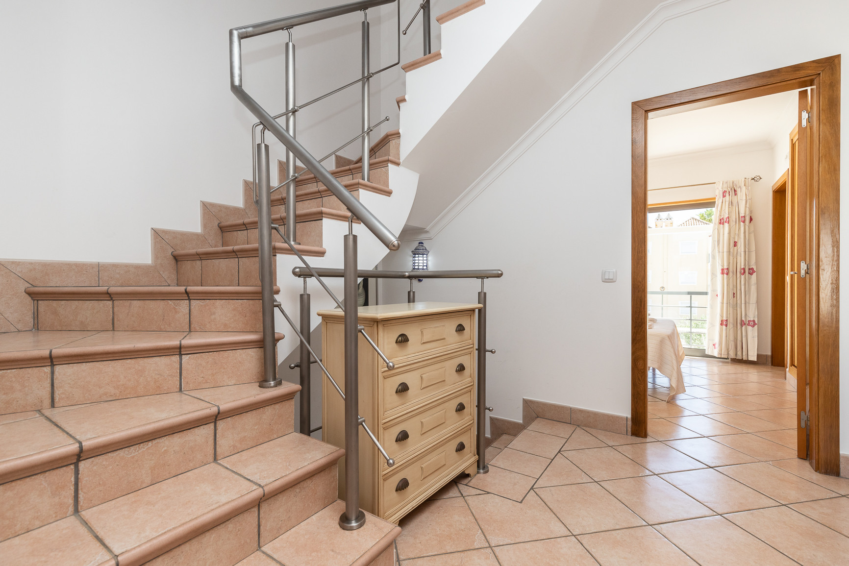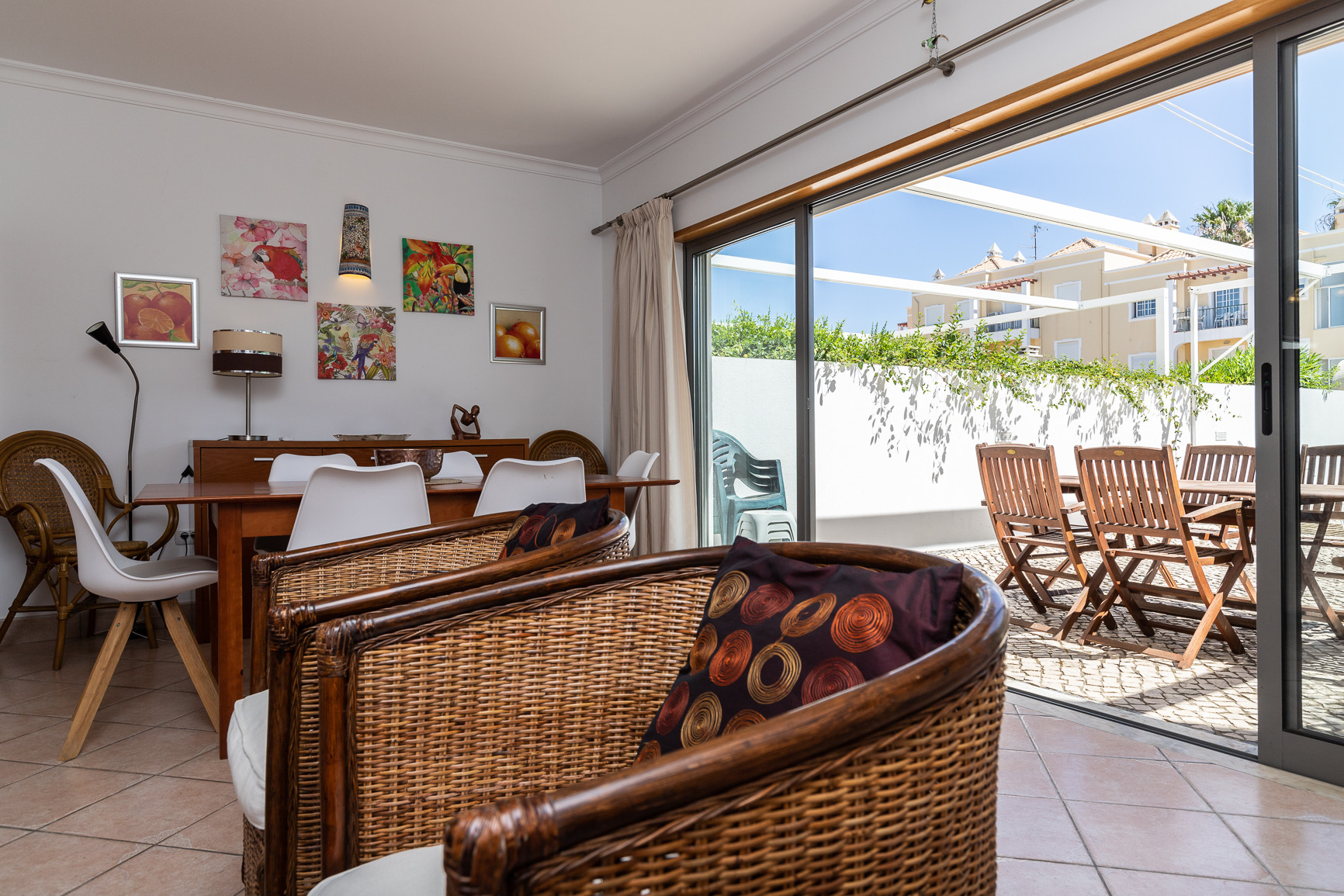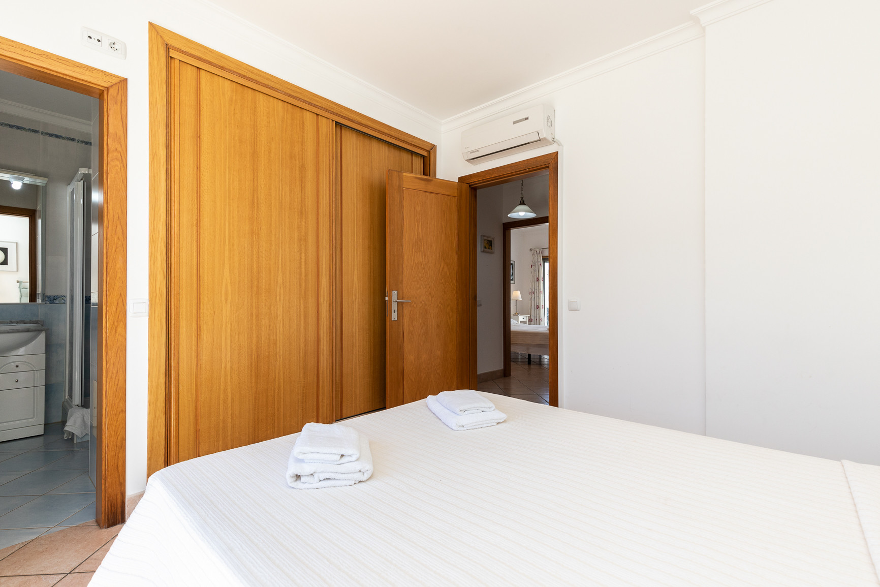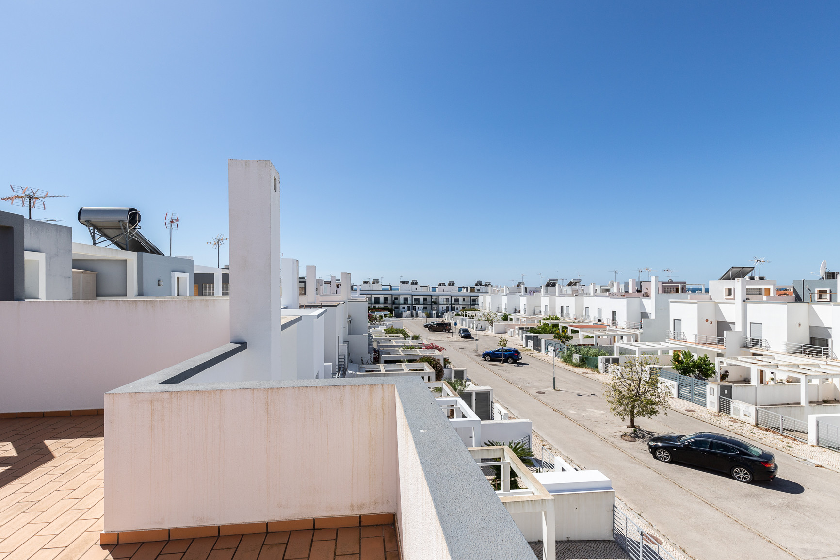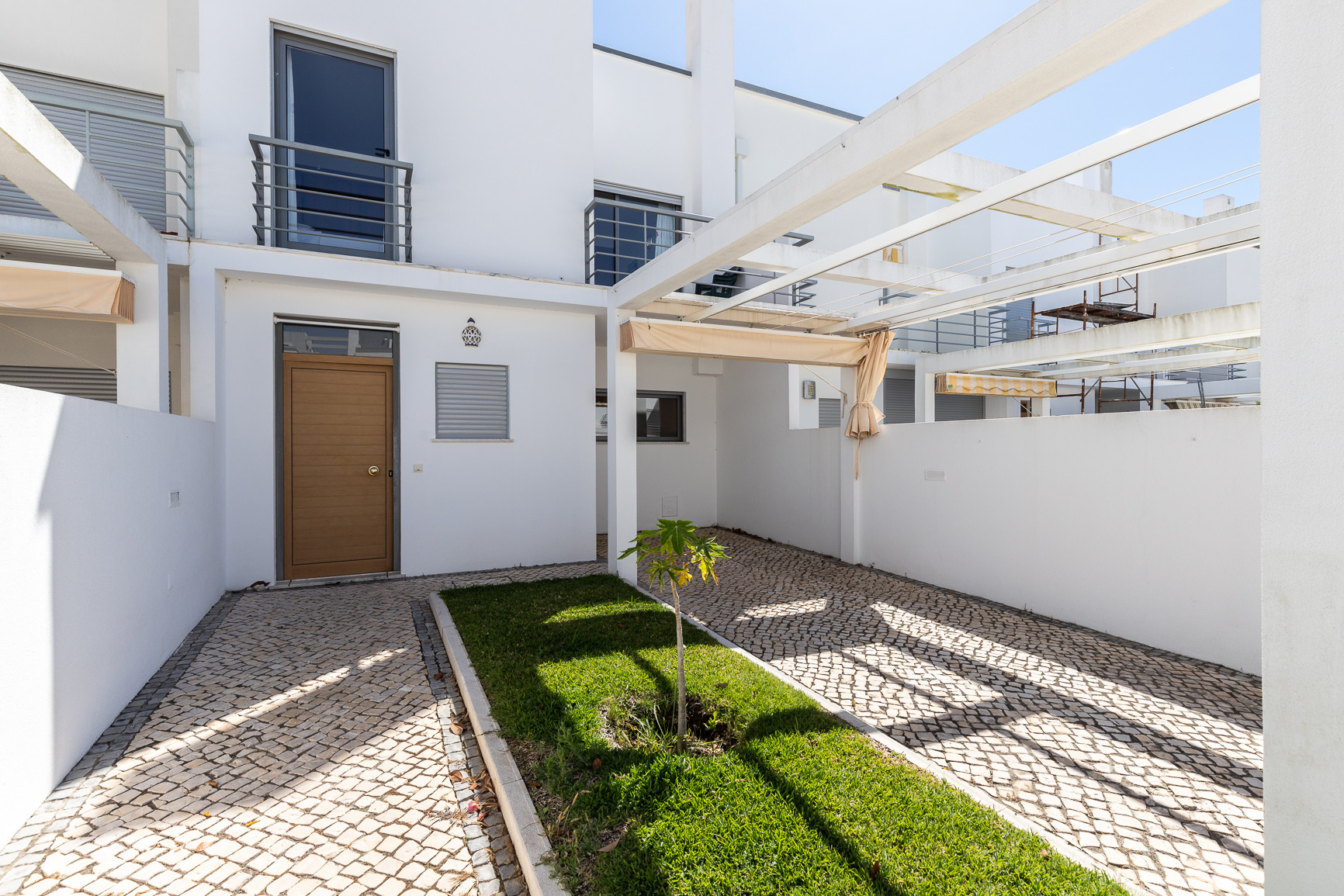El espacio exterior maximiza la vida al aire libre, con una piscina privada orientada al oeste, tumbonas para relajarse al sol, y una zona cubierta con toldo, equipada con mesa, sillas y barbacoa para comidas al aire libre. Una terraza adicional de 20m² con mobiliario de jardín proporciona más espacio para disfrutar del clima del Algarve. La vivienda dispone además de estacionamiento privativo para hasta 2 vehículos dentro de la propiedad.