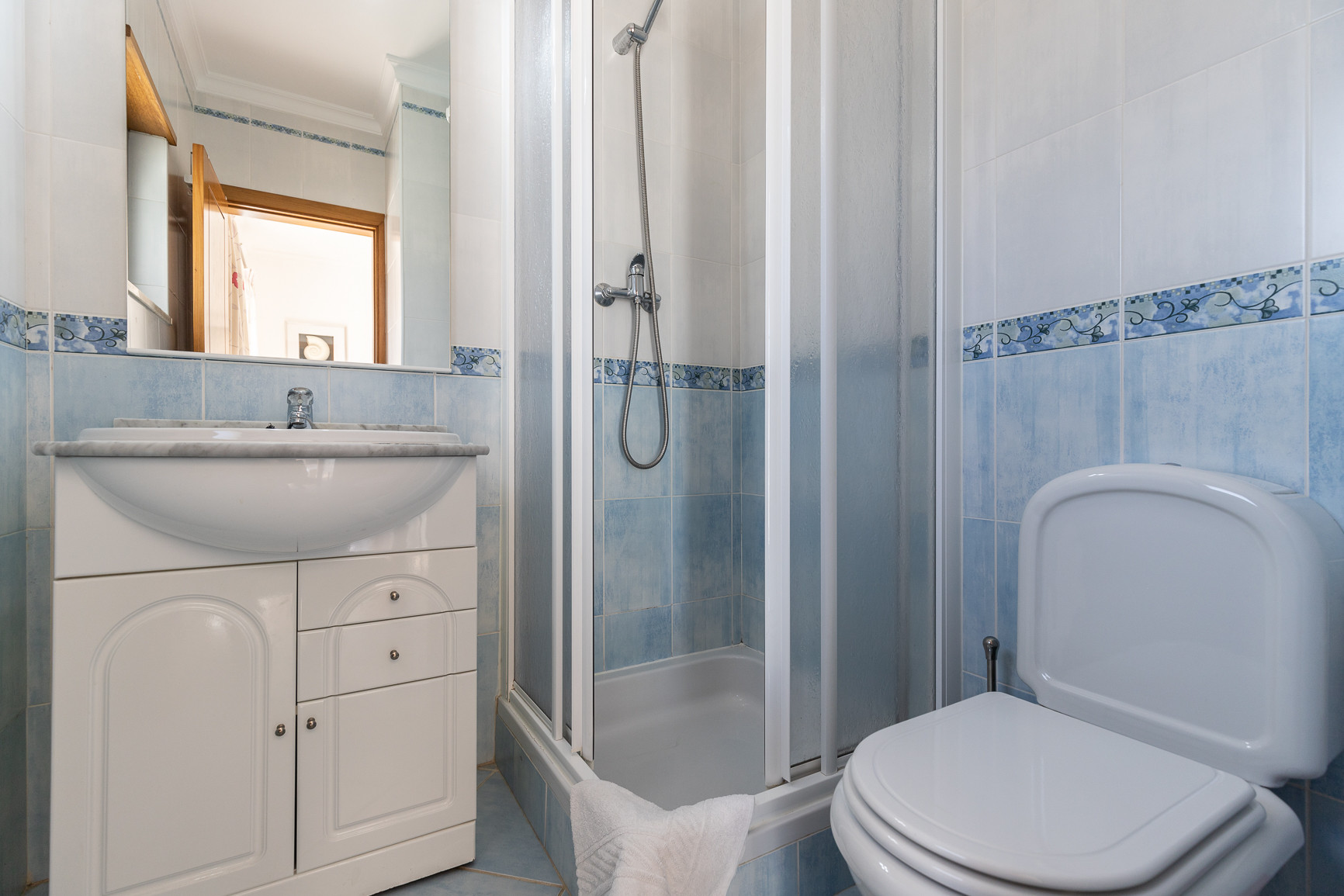 La vivienda cuenta con 3 habitaciones confortables, incluyendo una suite con cama de matrimonio y dos habitaciones con dos camas individuales cada una, todas con armarios empotrados. Dispone de 3 cuartos de baño — dos con ducha y uno con bañera — garantizando privacidad y comodidad para todos los huéspedes. Una de las habitaciones además se beneficia de un balcón orientado al este. En el ático, se encuentra una terraza con el área total de la casa y una fantástica vista al mar, perfecta para apreciar la puesta de sol o relajarse al final del día.