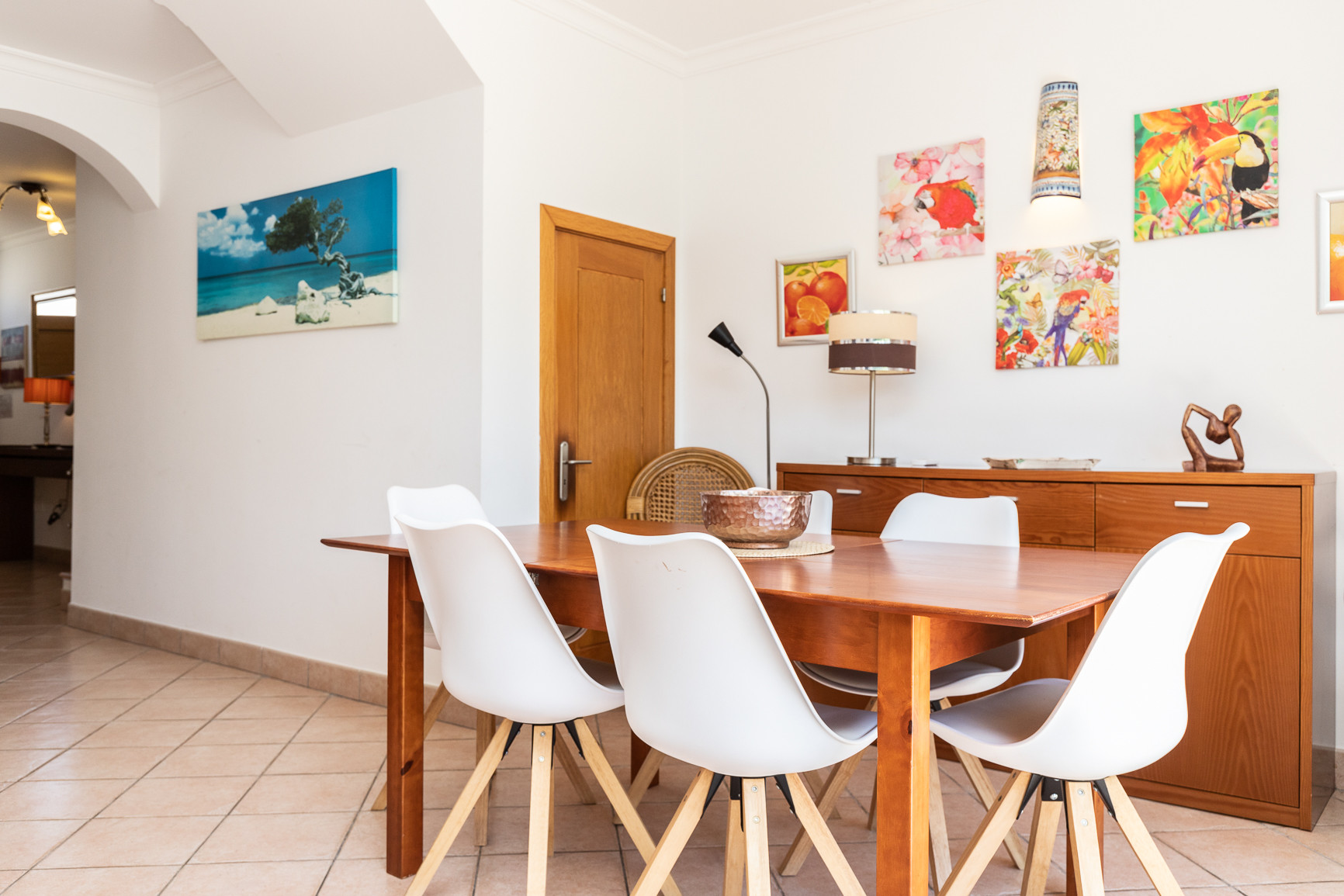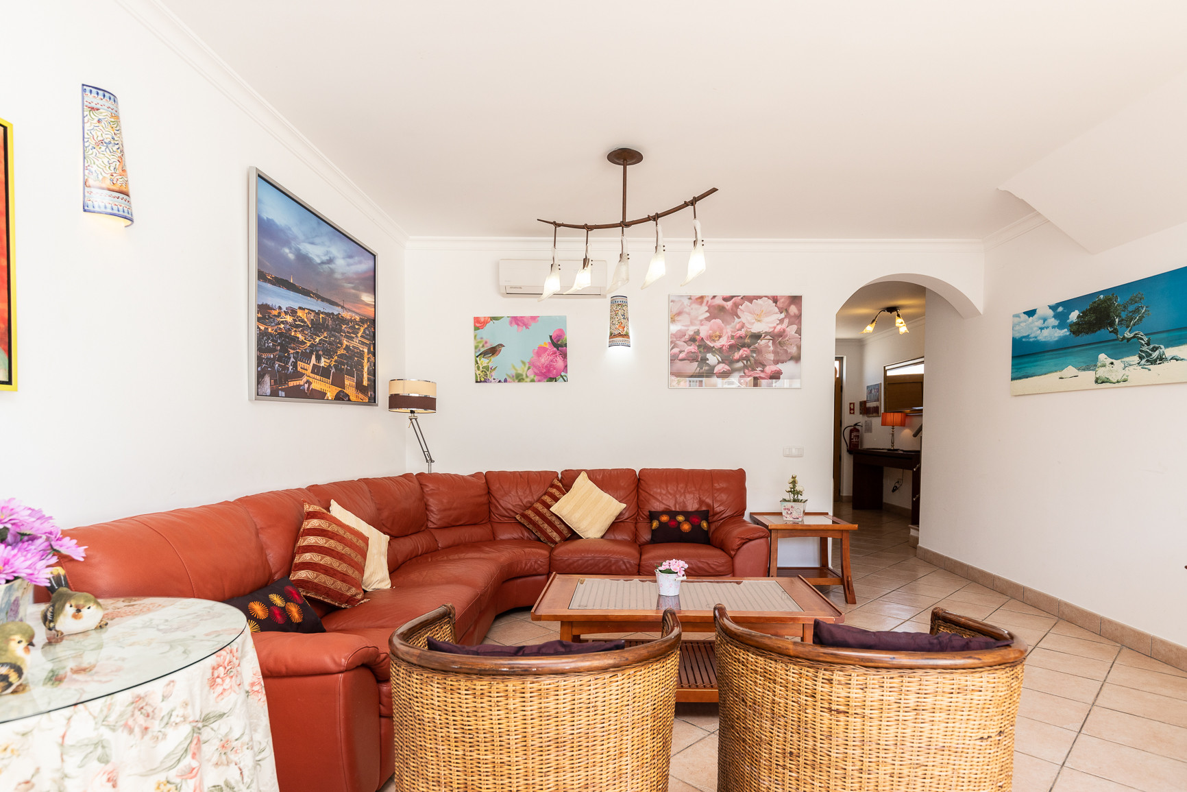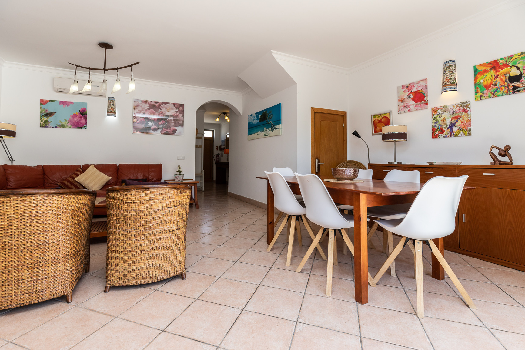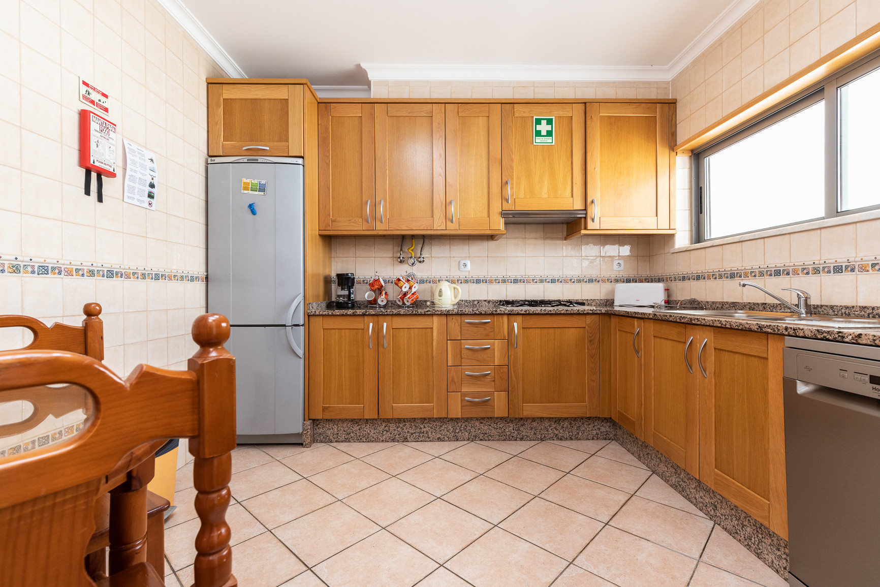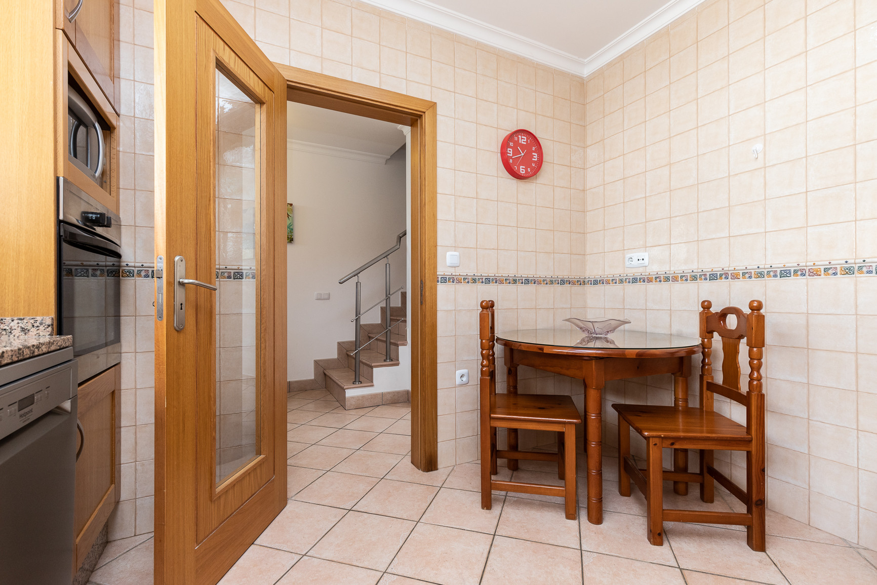 El interior de la vivienda fue cuidadosamente pensado para ofrecer comodidad y funcionalidad. La cocina americana totalmente equipada incluye frigorífico combinado, placa y horno, microondas, tostadora, hervidor eléctrico, máquina de café Nespresso y de filtro, lavavajillas y lavadora, además de todos los utensilios necesarios para preparar comidas. La amplia sala de estar y comedor tiene acceso directo al exterior y a la piscina, siendo ideal para momentos de convivencia. El alojamiento ofrece además aire acondicionado en todos los espacios, calefacción central, tres televisores y Wi-Fi gratuito.