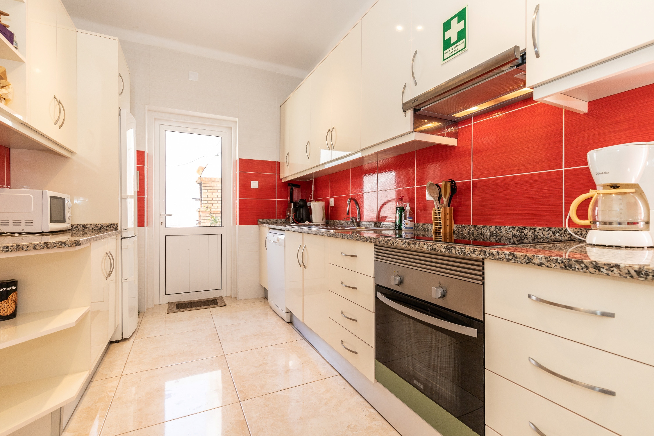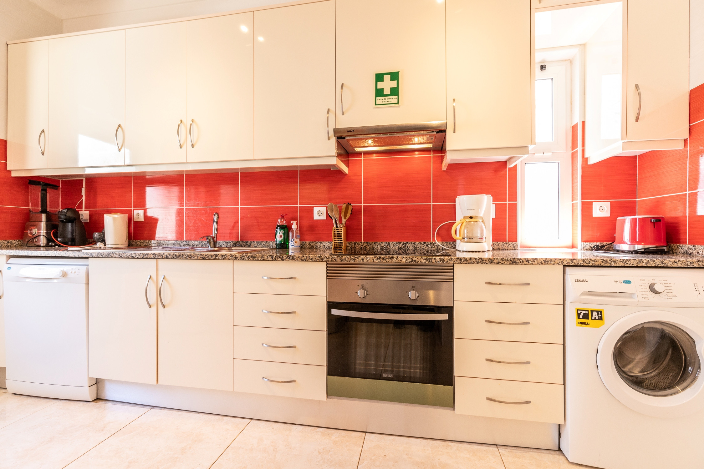 La cocina está equipada con electrodomésticos modernos, incluyendo frigorífico combinado, cocina, horno, microondas, tostadora, cafetera de filtro, lavavajillas y lavadora, así como todos los utensilios esenciales para preparar comidas. La casa también cuenta con dos televisores con servicio MEO, Wi-Fi gratuito, calefacción central, aire acondicionado en todas las habitaciones y plancha.