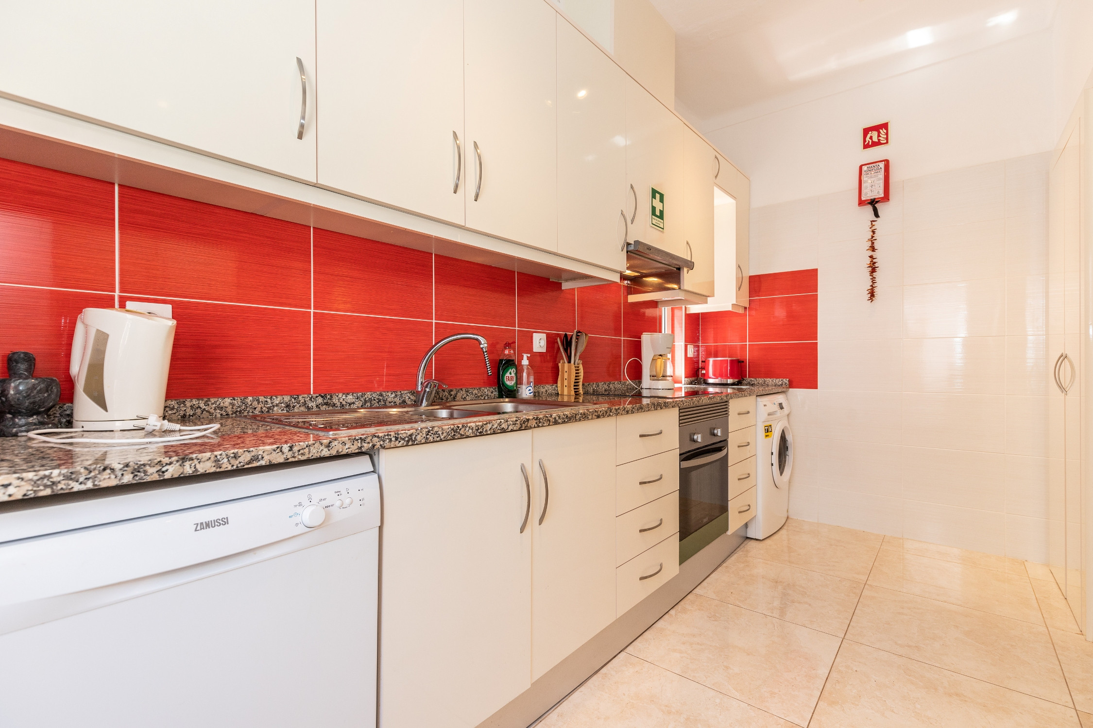 La cocina está equipada con todos los electrodomésticos esenciales, incluyendo frigorífico combinado, cocina, horno, microondas, tostadora, cafetera de cápsulas Dolce Gusto, jarra eléctrica, lavavajillas y lavadora, garantizando total comodidad durante la estancia.