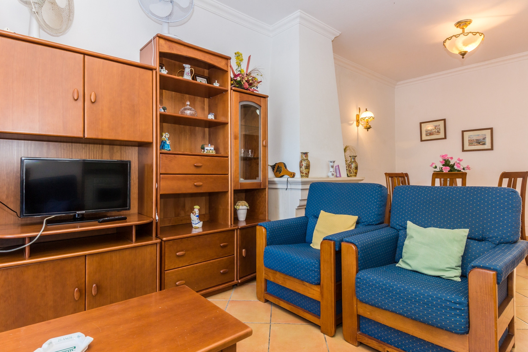 La propiedad, con aproximadamente 110 m², se compone de un hall de entrada, tres dormitorios bien distribuidos — dos con cama de matrimonio (uno de ellos en suite con ducha) y uno con dos camas individuales — y dos baños completos, ambos con ducha. La sala de estar y comedor es acogedora y equipada con televisión, siendo perfecta para momentos de descanso después de un día de playa.