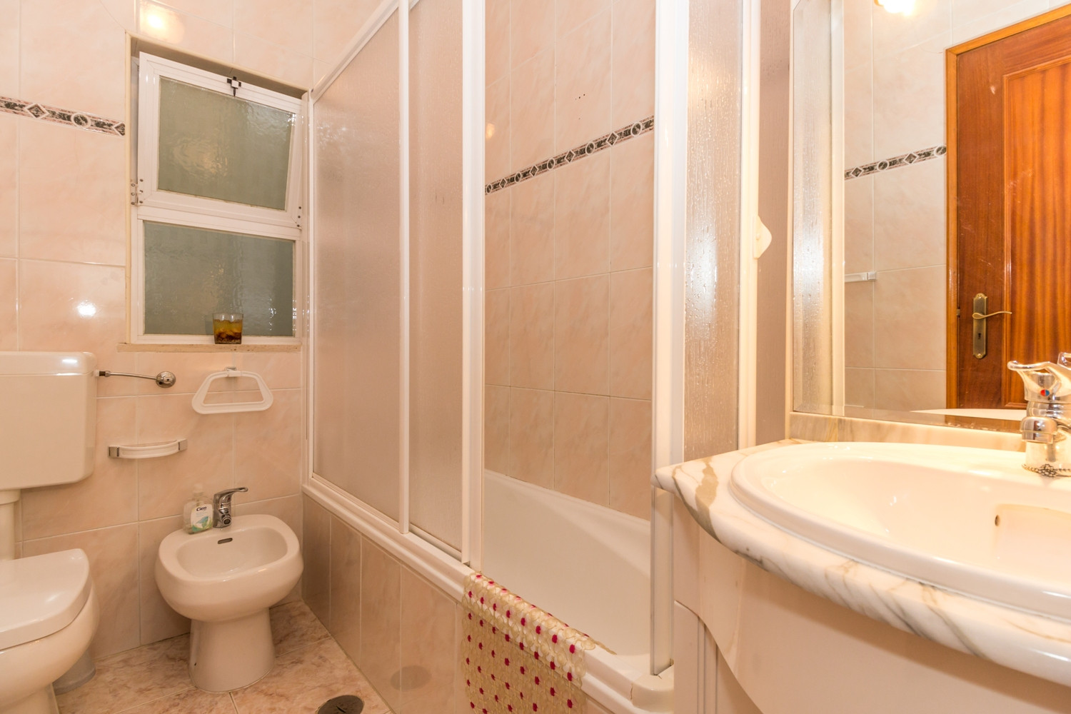 La propiedad, con aproximadamente 110 m², se compone de un hall de entrada, tres dormitorios bien distribuidos — dos con cama de matrimonio (uno de ellos en suite con ducha) y uno con dos camas individuales — y dos baños completos, ambos con ducha. La sala de estar y comedor es acogedora y equipada con televisión, siendo perfecta para momentos de descanso después de un día de playa.