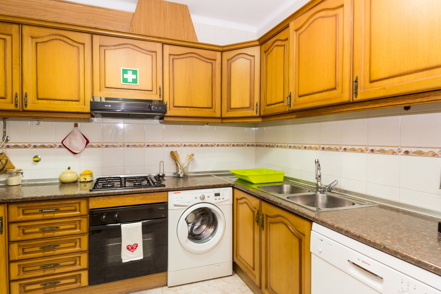 La cocina está equipada con todos los electrodomésticos esenciales, incluyendo frigorífico combinado, cocina, horno, microondas, tostadora, cafetera de cápsulas Dolce Gusto, jarra eléctrica, lavavajillas y lavadora, garantizando total comodidad durante la estancia.