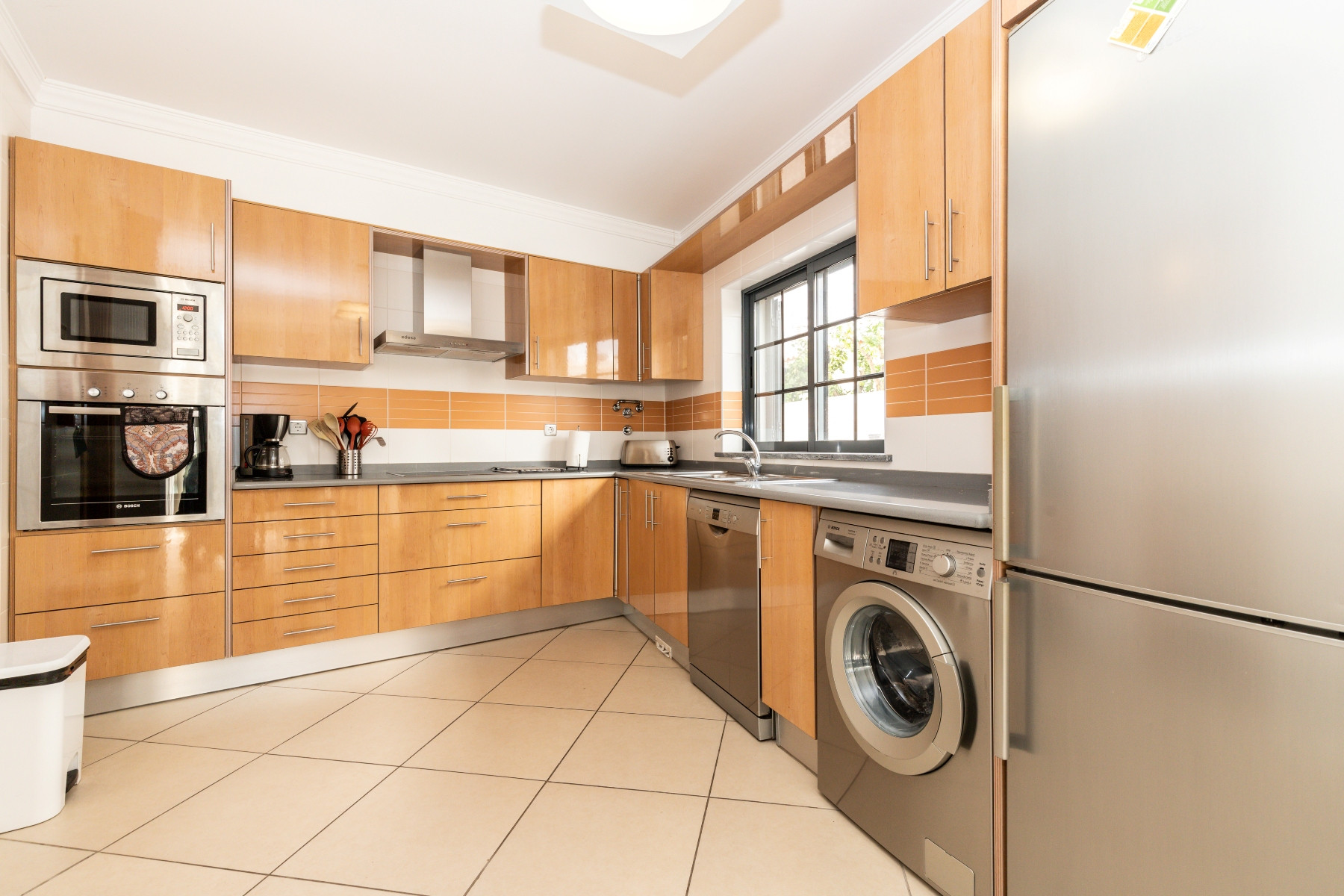 La cocina está equipada con todos los electrodomésticos esenciales, incluyendo frigorífico combinado, cocina, horno, microondas, tostadora, cafetera de cápsulas Dolce Gusto, jarra eléctrica, lavavajillas y lavadora, garantizando total comodidad durante la estancia.