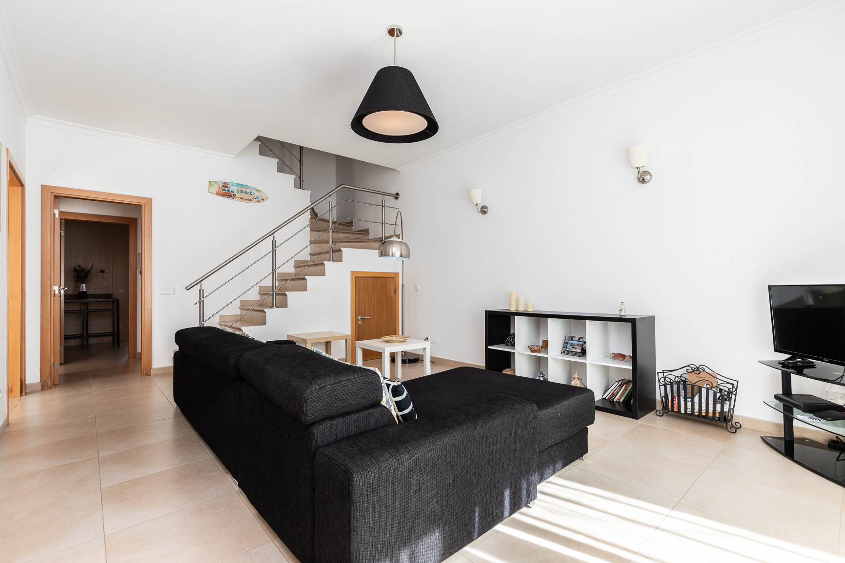 La propiedad, con aproximadamente 110 m², se compone de un hall de entrada, tres dormitorios bien distribuidos — dos con cama de matrimonio (uno de ellos en suite con ducha) y uno con dos camas individuales — y dos baños completos, ambos con ducha. La sala de estar y comedor es acogedora y equipada con televisión, siendo perfecta para momentos de descanso después de un día de playa.