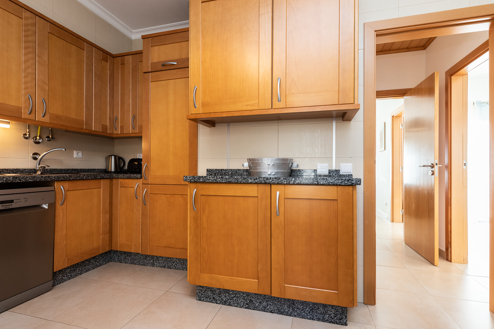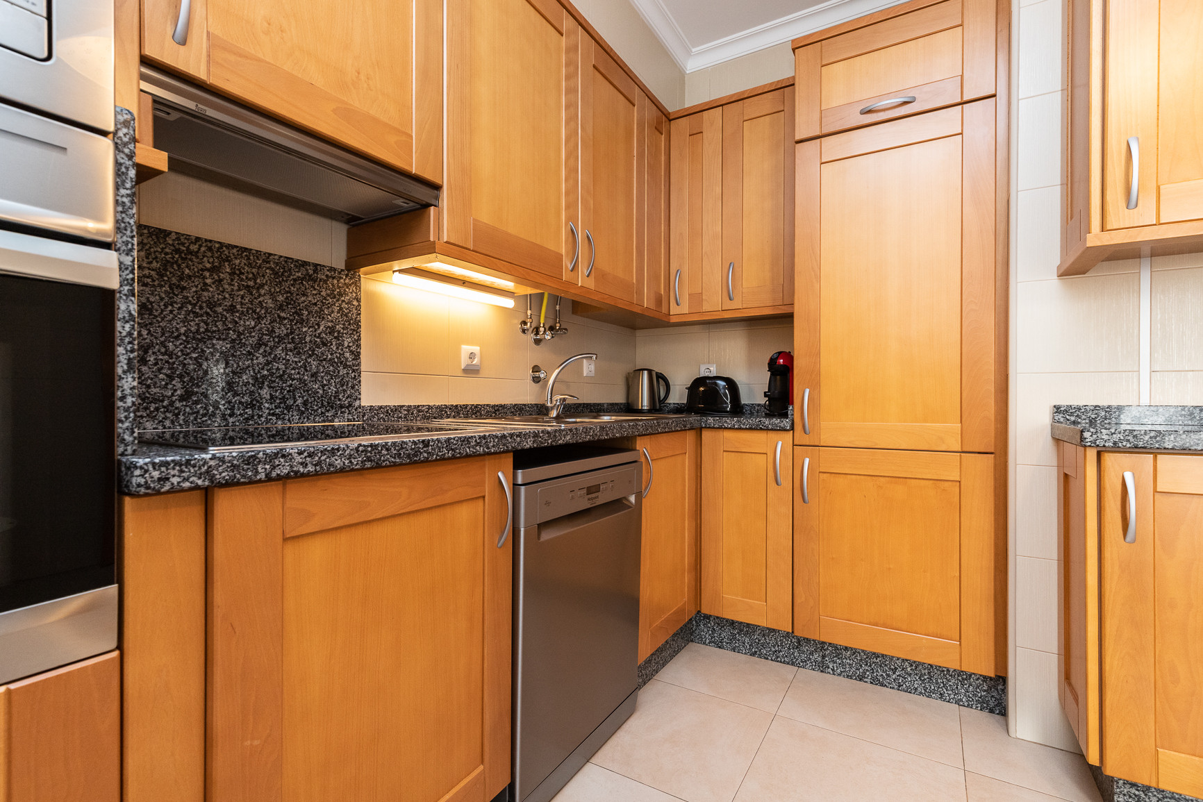 La cocina está equipada con todos los electrodomésticos esenciales, incluyendo frigorífico combinado, cocina, horno, microondas, tostadora, cafetera de cápsulas Dolce Gusto, jarra eléctrica, lavavajillas y lavadora, garantizando total comodidad durante la estancia.