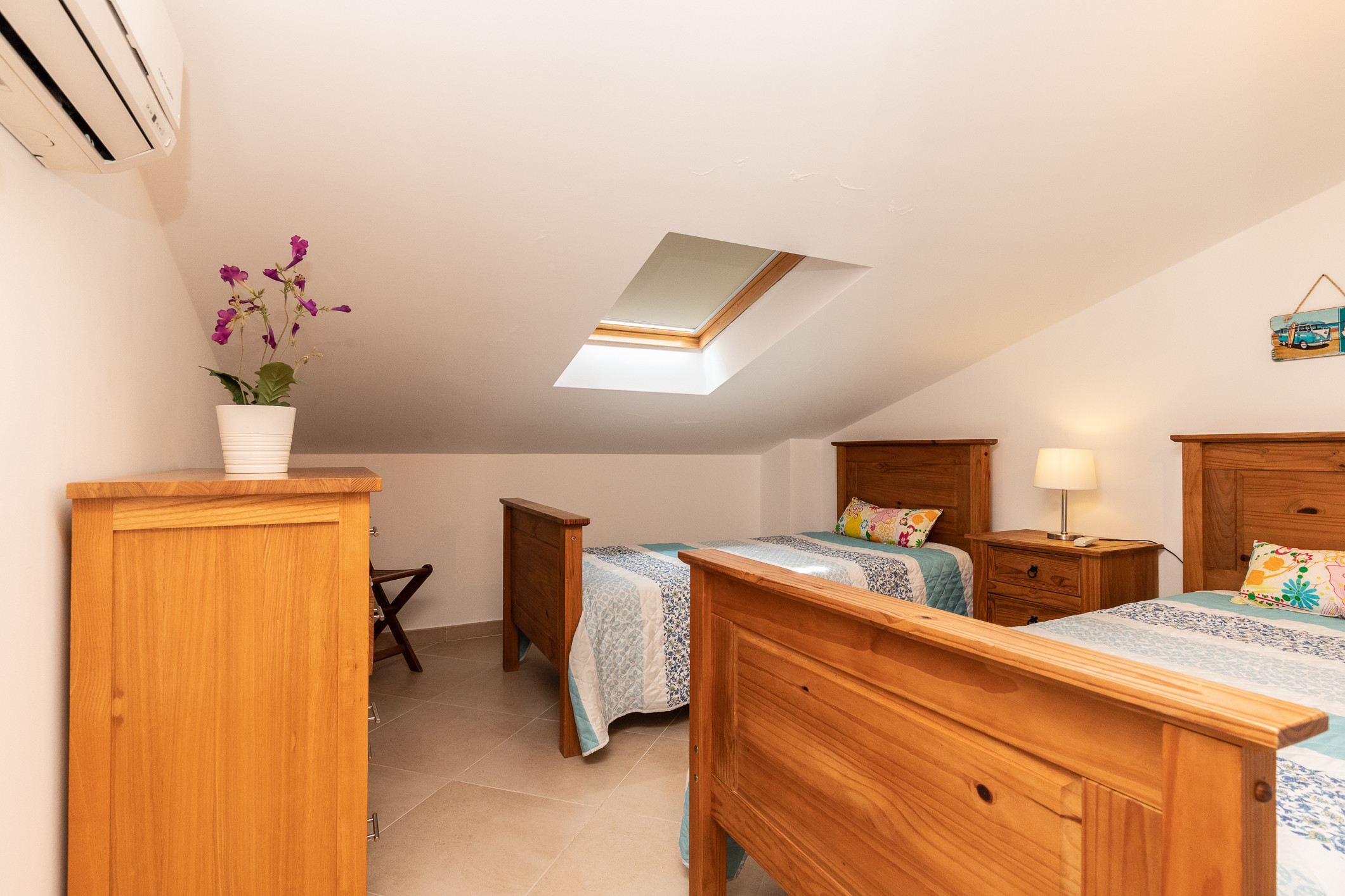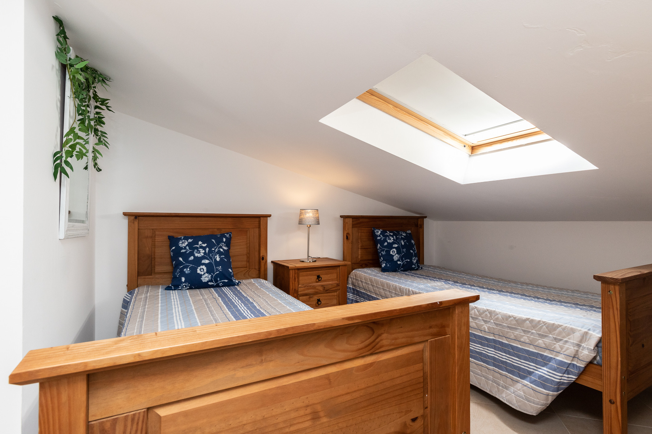 La primera planta dispone de dos habitaciones dobles con armarios empotrados y acceso a un generoso balcón orientado al este, así como de un amplio cuarto de baño con bañera, de uso común para las habitaciones. En el ático, las dos habitaciones con camas individuales comparten un cuarto de baño de servicio.