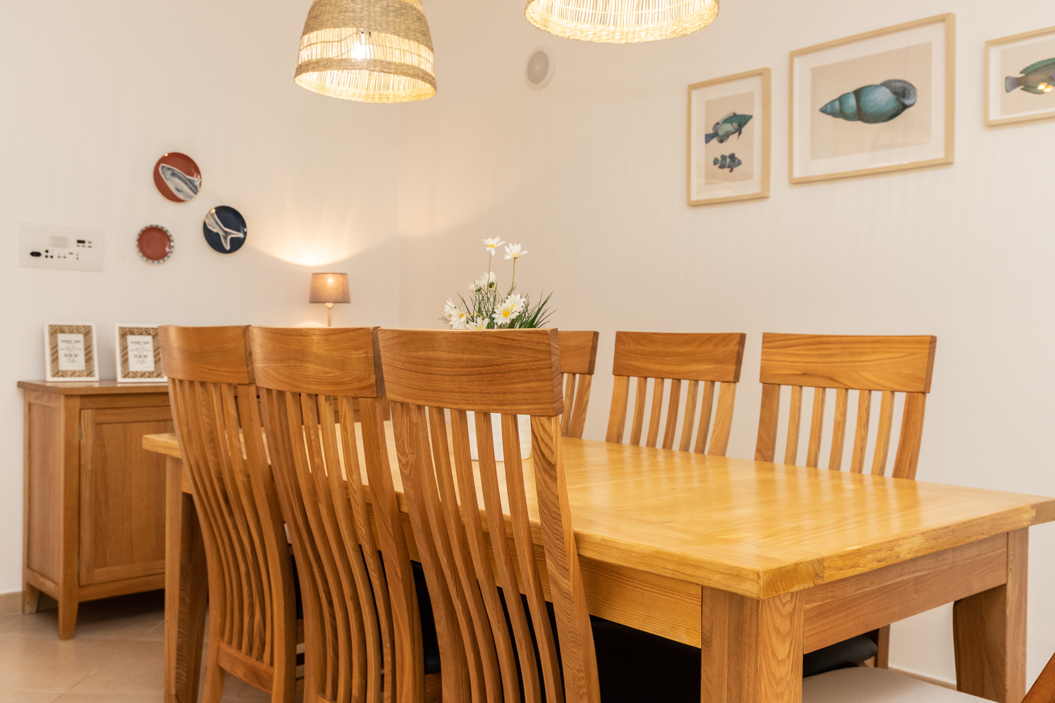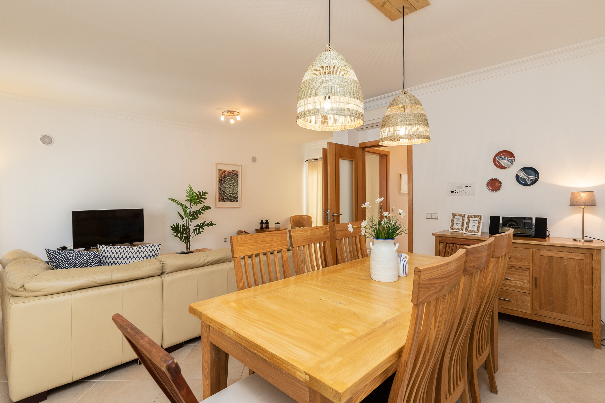 En la planta baja, se encuentra una amplia sala de estar con TV, un comedor con capacidad para ocho personas, un baño de servicio y una cocina independiente totalmente equipada con electrodomésticos modernos, incluyendo cocina de inducción, horno, frigorífico, microondas, lavadora, lavavajillas, tostadora y cafetera Nespresso, así como todos los utensilios necesarios para preparar comidas.