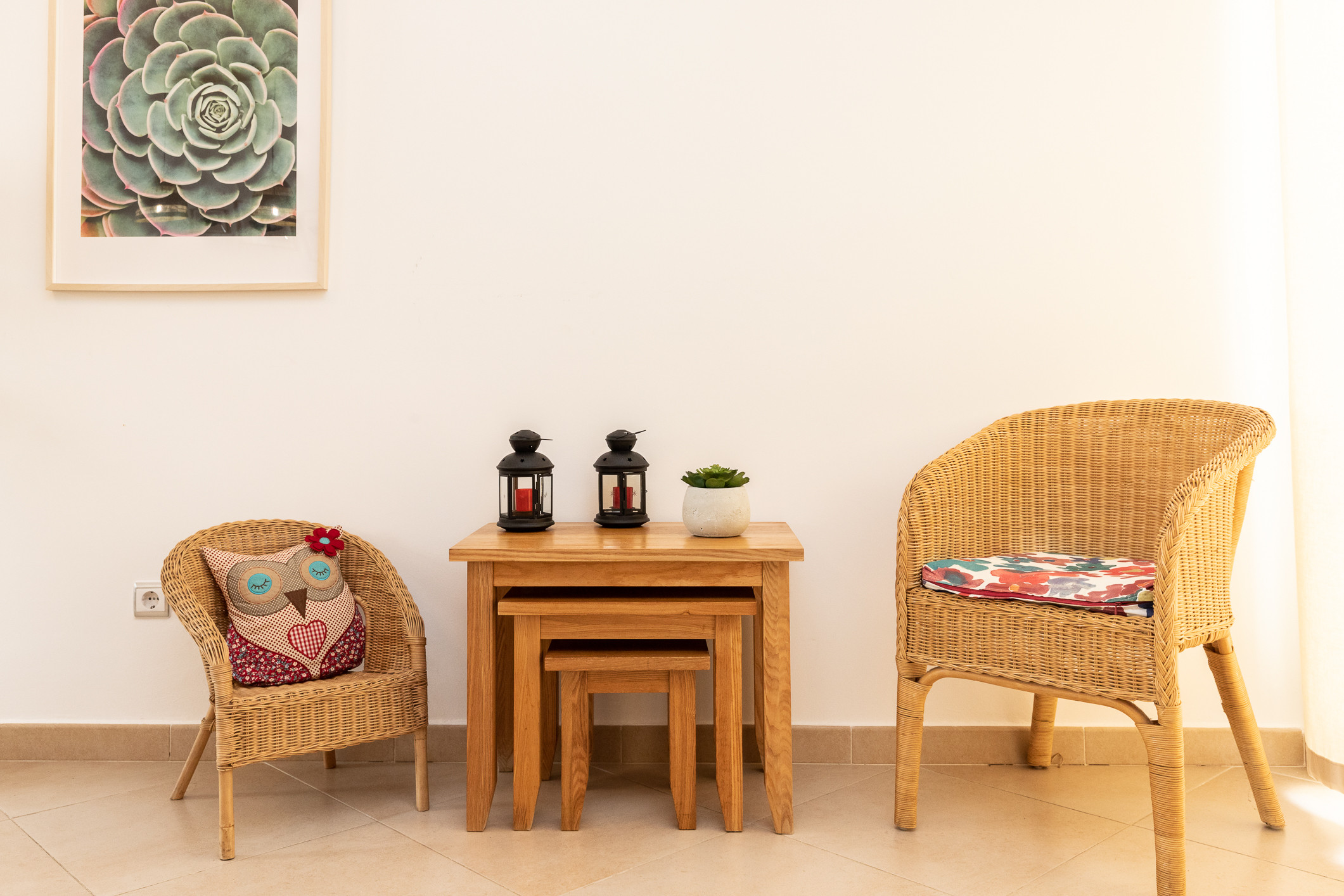 En la planta baja se encuentran la sala de estar y comedor, una despensa, la cocina totalmente equipada con horno, frigorífico combinado, microondas, tostadora, hervidor, cafetera de cápsulas DOLCE GUSTO, lavadora y lavavajillas, y un baño con ducha de esquina. Un amplio patio rodea la vivienda por el lado norte, ofreciendo zona de lounge, mesa y sillas, barbacoa y fregadero, ideal para comidas al aire libre. Hay además espacio para estacionar dos vehículos dentro de la puerta.