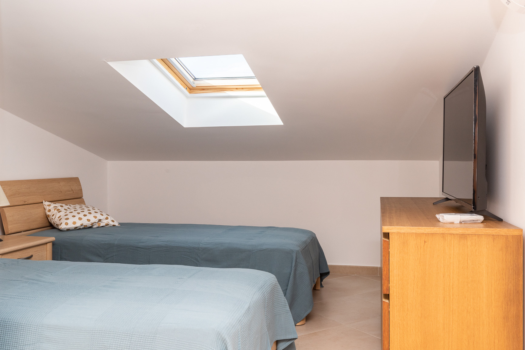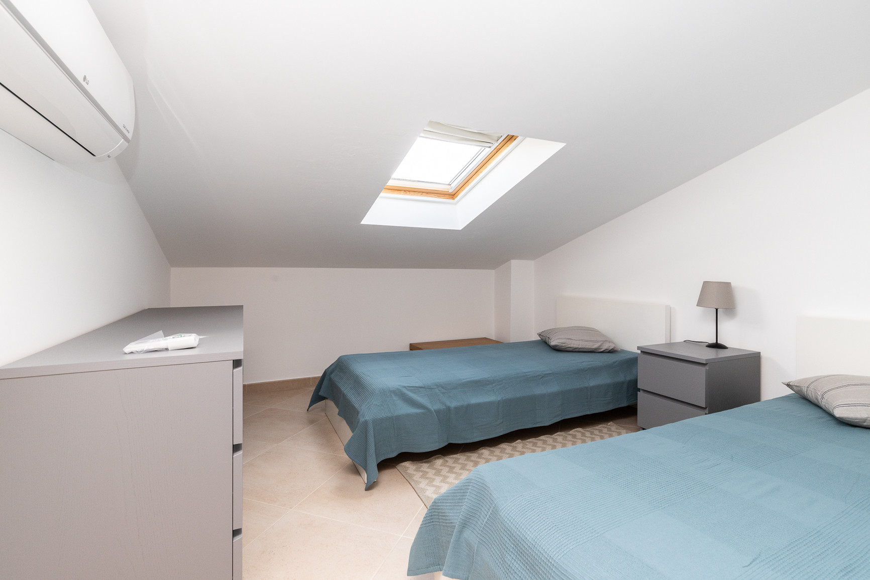 La primera planta dispone de dos habitaciones dobles con armarios empotrados y acceso a un generoso balcón orientado al este, así como de un amplio cuarto de baño con bañera, de uso común para las habitaciones. En el ático, las dos habitaciones con camas individuales comparten un cuarto de baño de servicio.