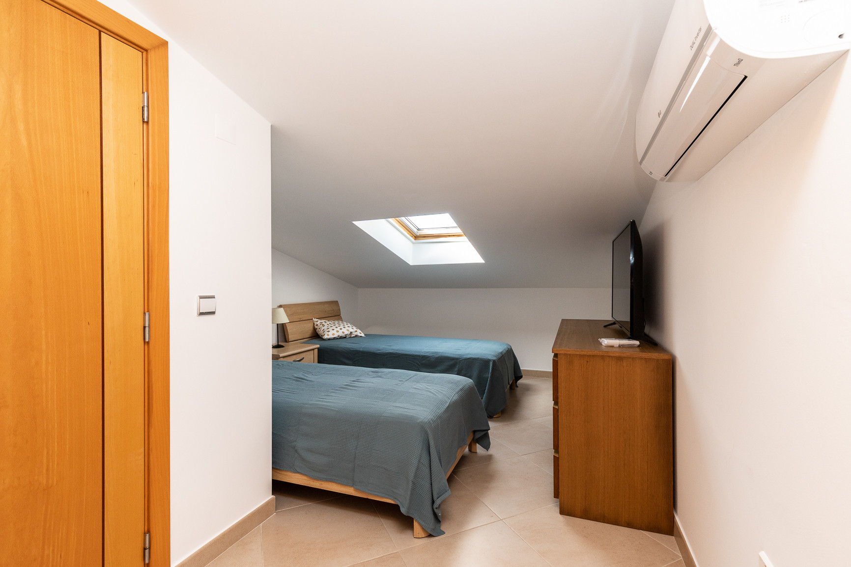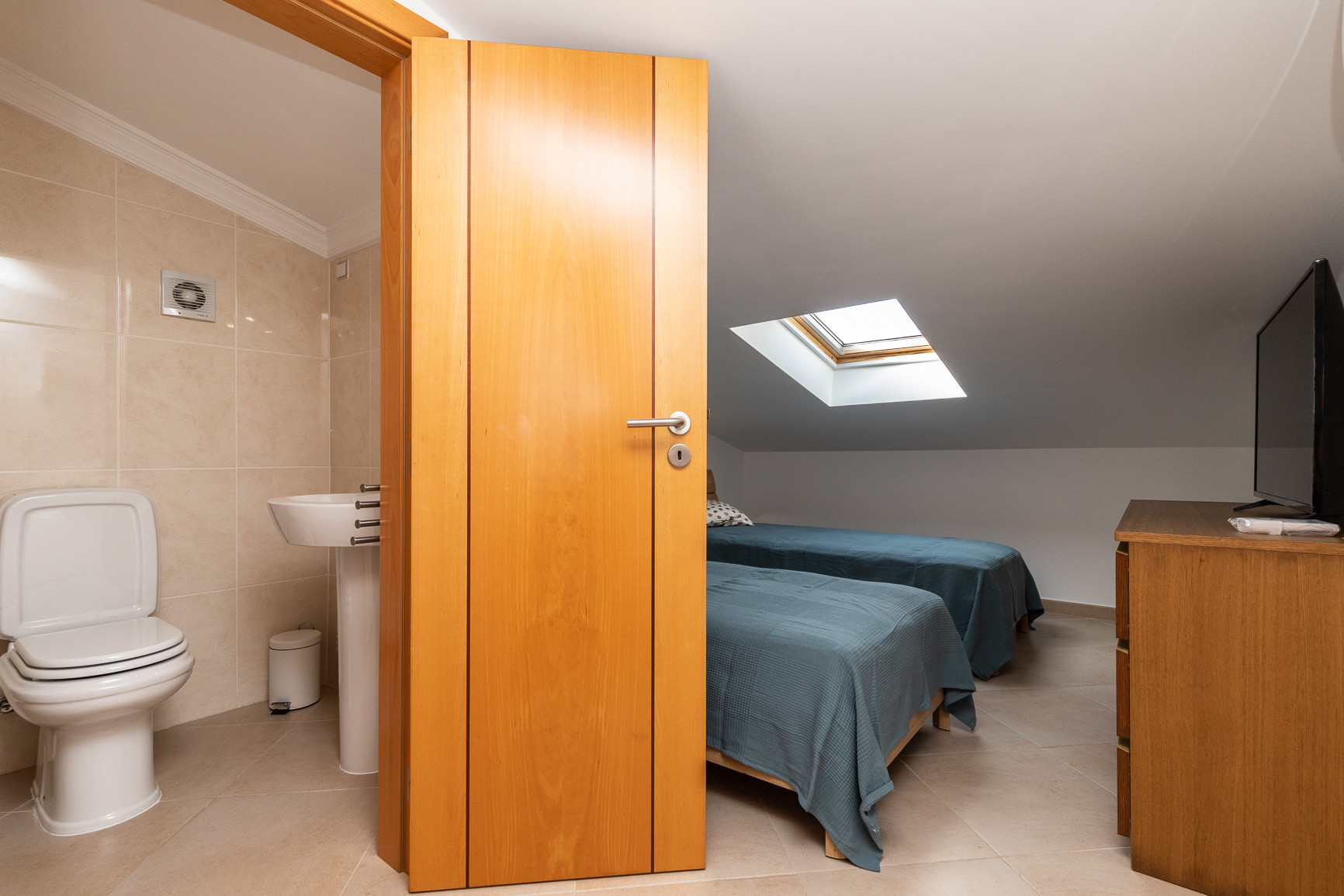 Distribuida por tres pisos e sótão, a casa dispõe de quatro quartos cuidadosamente decorados: dois com camas de casal (um deles em suíte com poliban de hidromassagem) e dois com camas individuais, garantindo flexibilidade para diferentes configurações de grupo. Ao todo, conta com três casas de banho completas uma com chuveiro, outra com banheira e uma de serviço assegurando conforto e privacidade para todos os hóspedes.