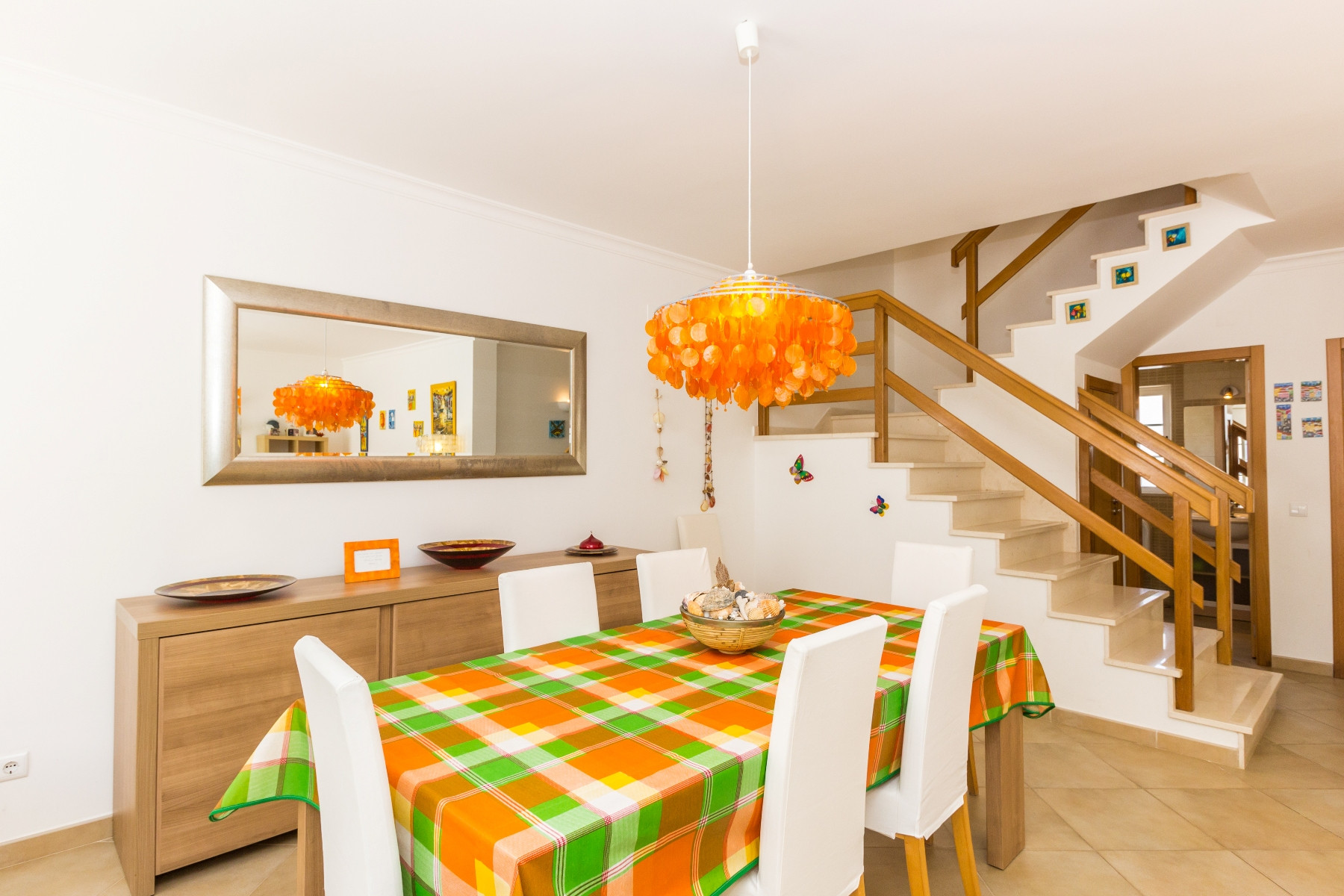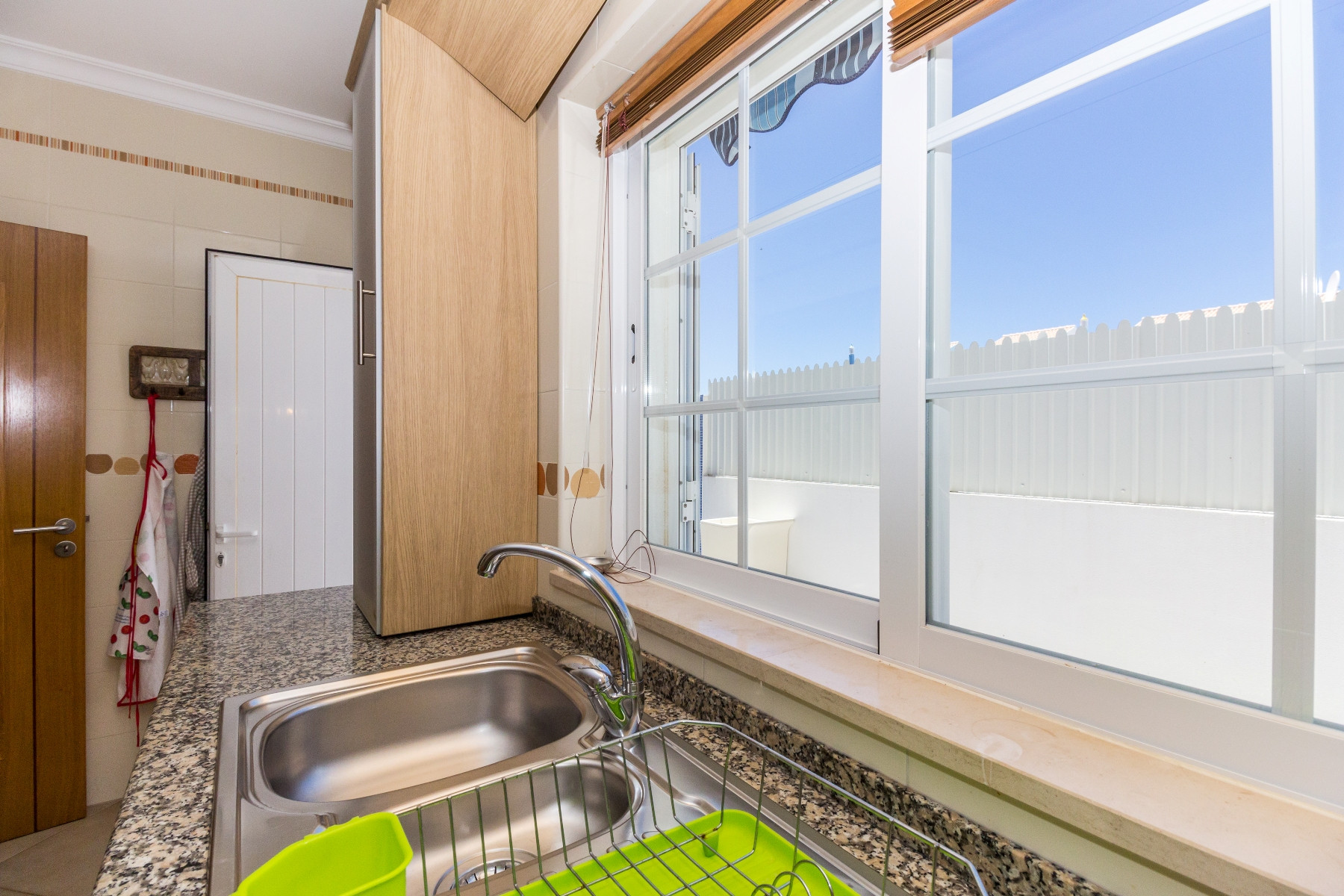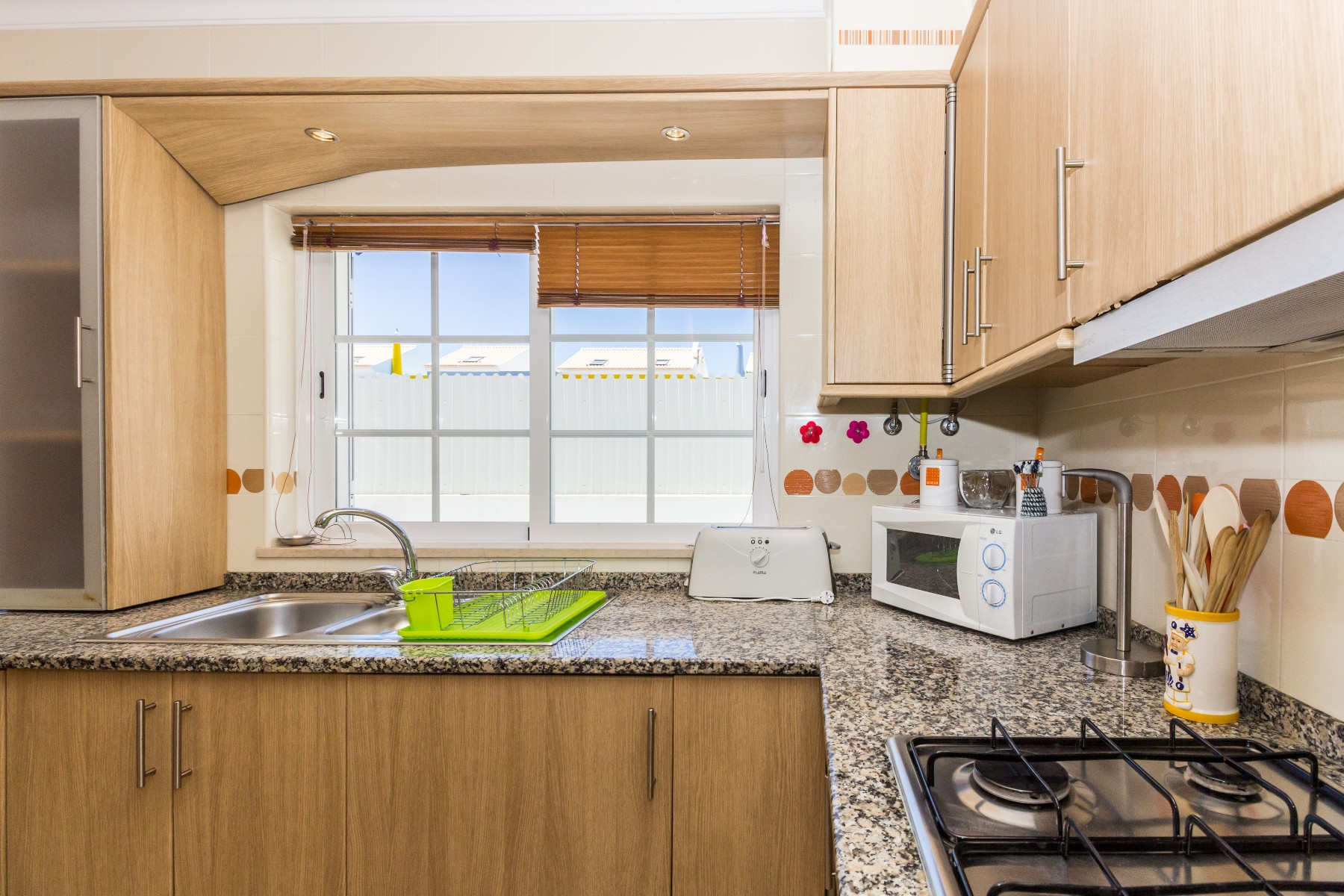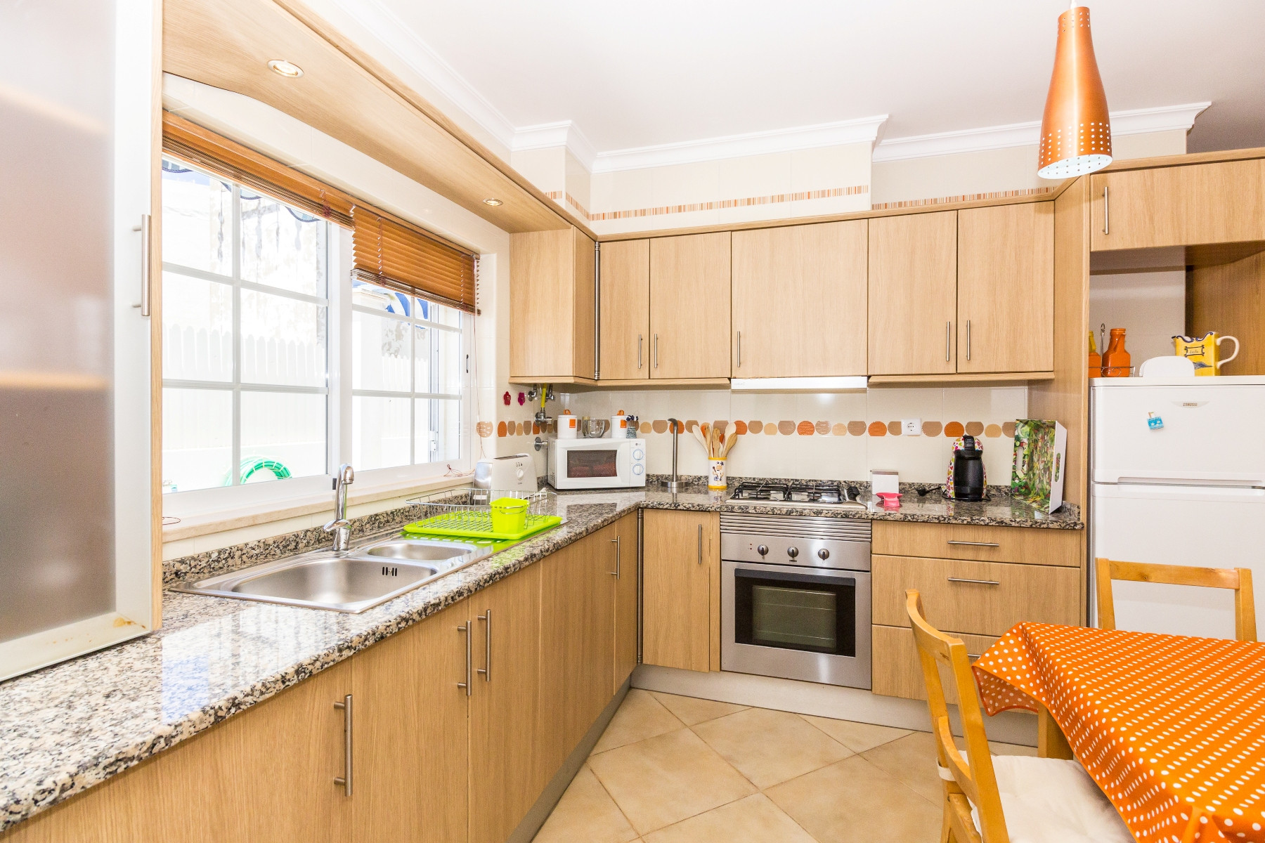 En la planta baja se encuentran la sala de estar y comedor, una despensa, la cocina totalmente equipada con horno, frigorífico combinado, microondas, tostadora, hervidor, cafetera de cápsulas DOLCE GUSTO, lavadora y lavavajillas, y un baño con ducha de esquina. Un amplio patio rodea la vivienda por el lado norte, ofreciendo zona de lounge, mesa y sillas, barbacoa y fregadero, ideal para comidas al aire libre. Hay además espacio para estacionar dos vehículos dentro de la puerta.