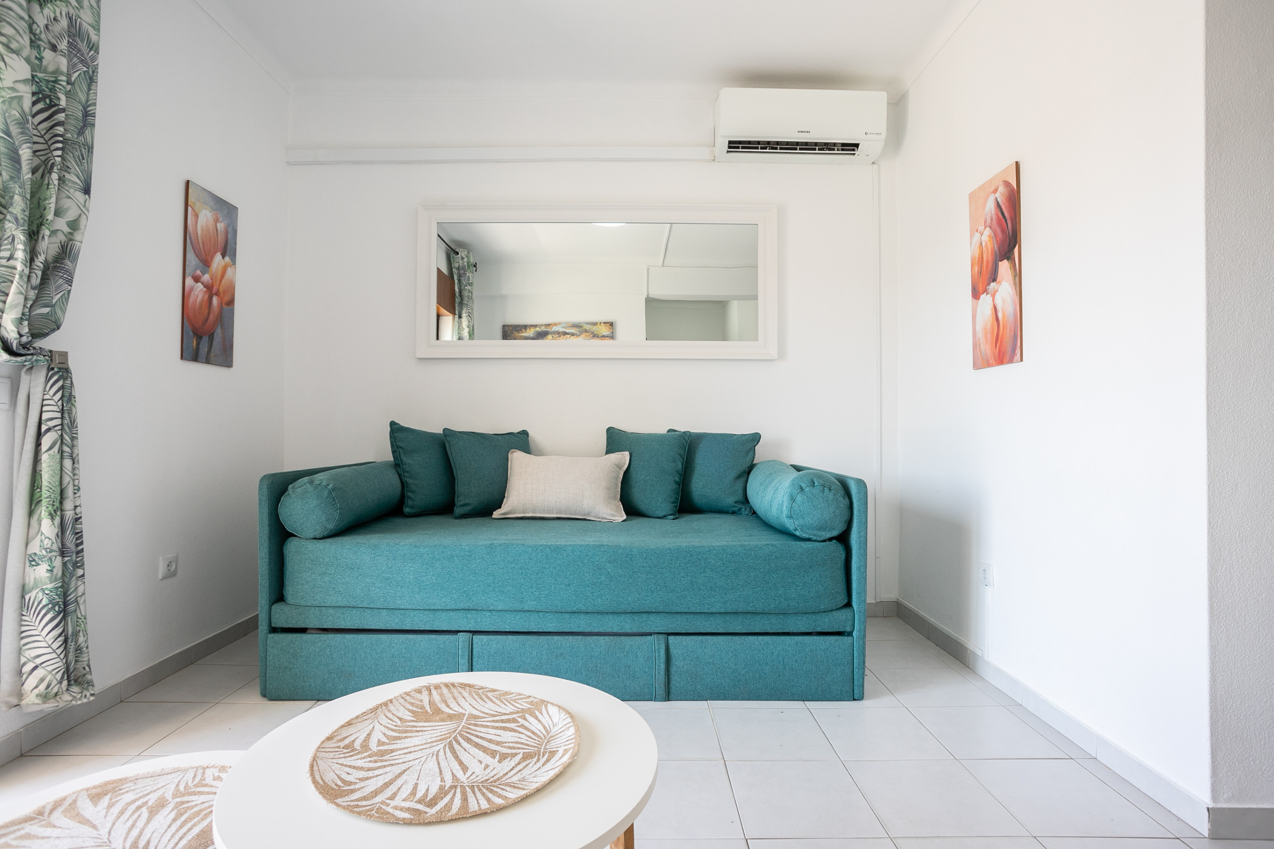 L'appartement dispose d'une chambre spacieuse avec un lit double confortable et un canapé-lit supplémentaire, permettant d'accueillir jusqu'à 4 personnes avec facilité. L'espace social est accueillant et lumineux, avec la climatisation dans le salon pour garantir le maximum de confort pendant les journées les plus chaudes.